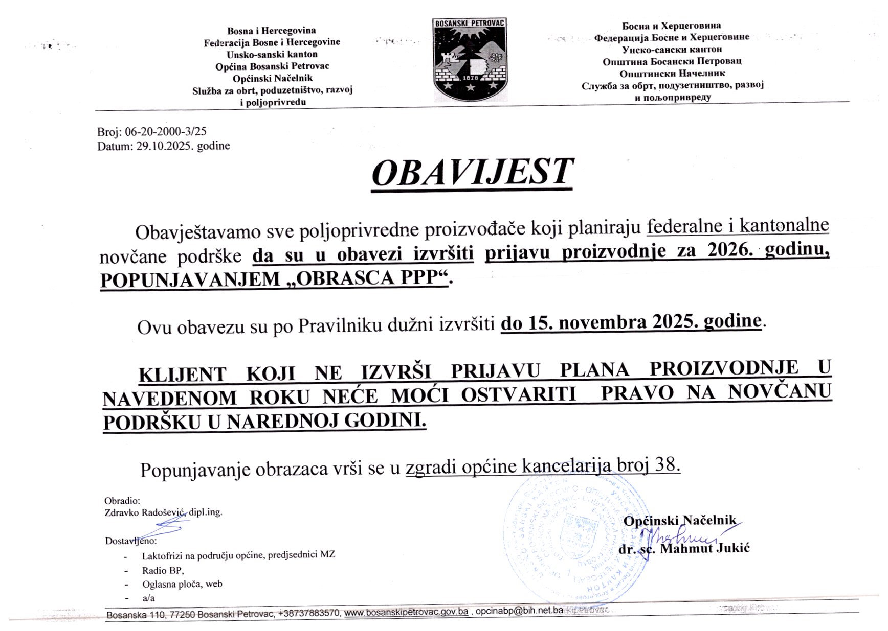 Obavijest za poljoprivredne proizvođače