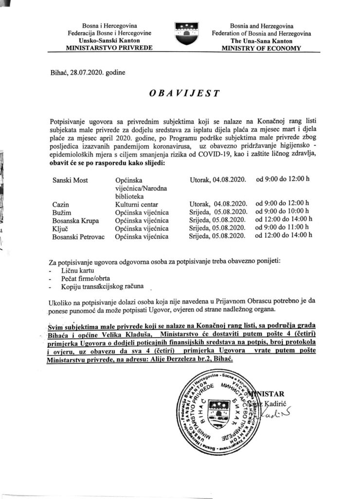 Obavještavaju se privredni subjekti sa područja općine Bosanski Petrovac da će se potpisivanje ugovora za dodjelu sredstava za isplatu dijela plaća za MART i APRIL 2020.godine po Programu podrške subjektima male privrede zbog posljedica izazvane pandemijom korona virusa održati 05.08.2020.godine u 12:00 sati u Sali vijećnice.