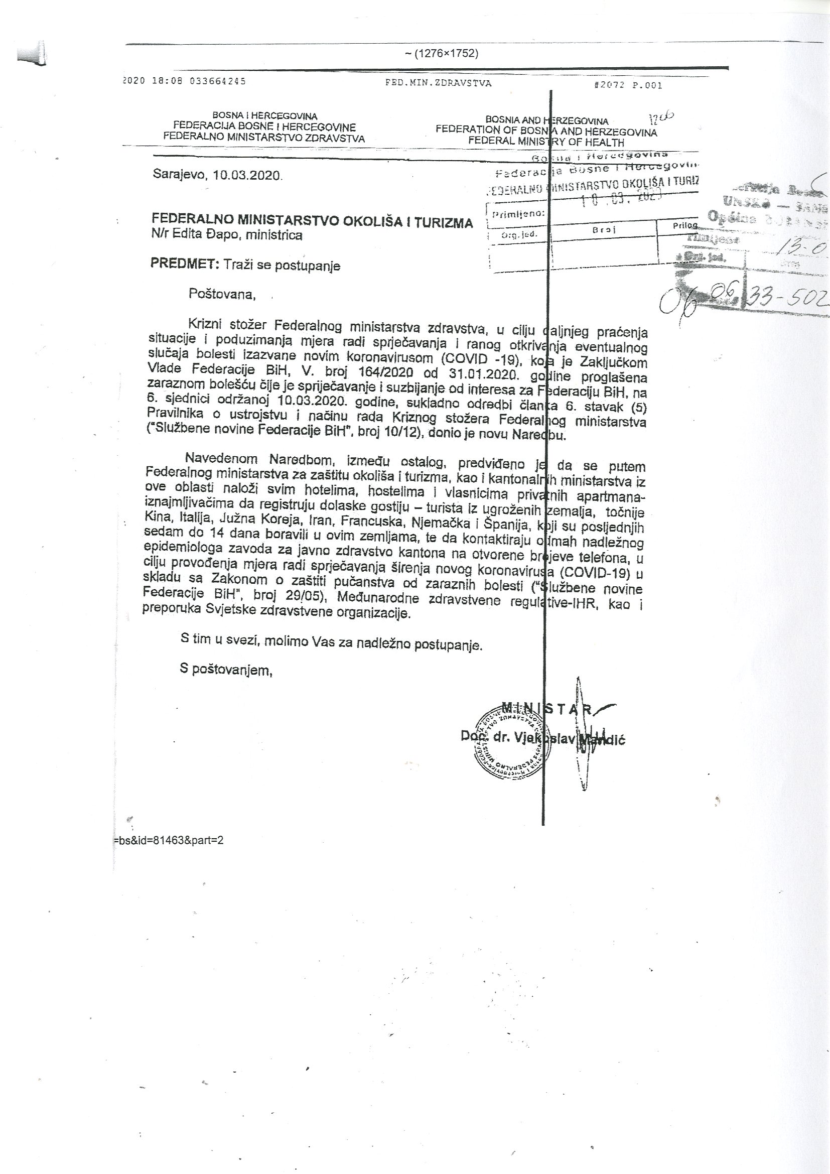 Dopis Federalno ministarstvo okoliša i turizma