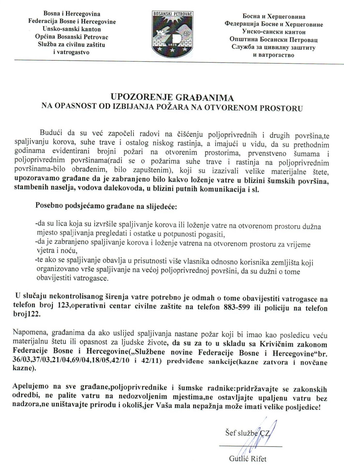 UPOZORENJE GRAĐANIMA BOSANSKOG PETROVCA