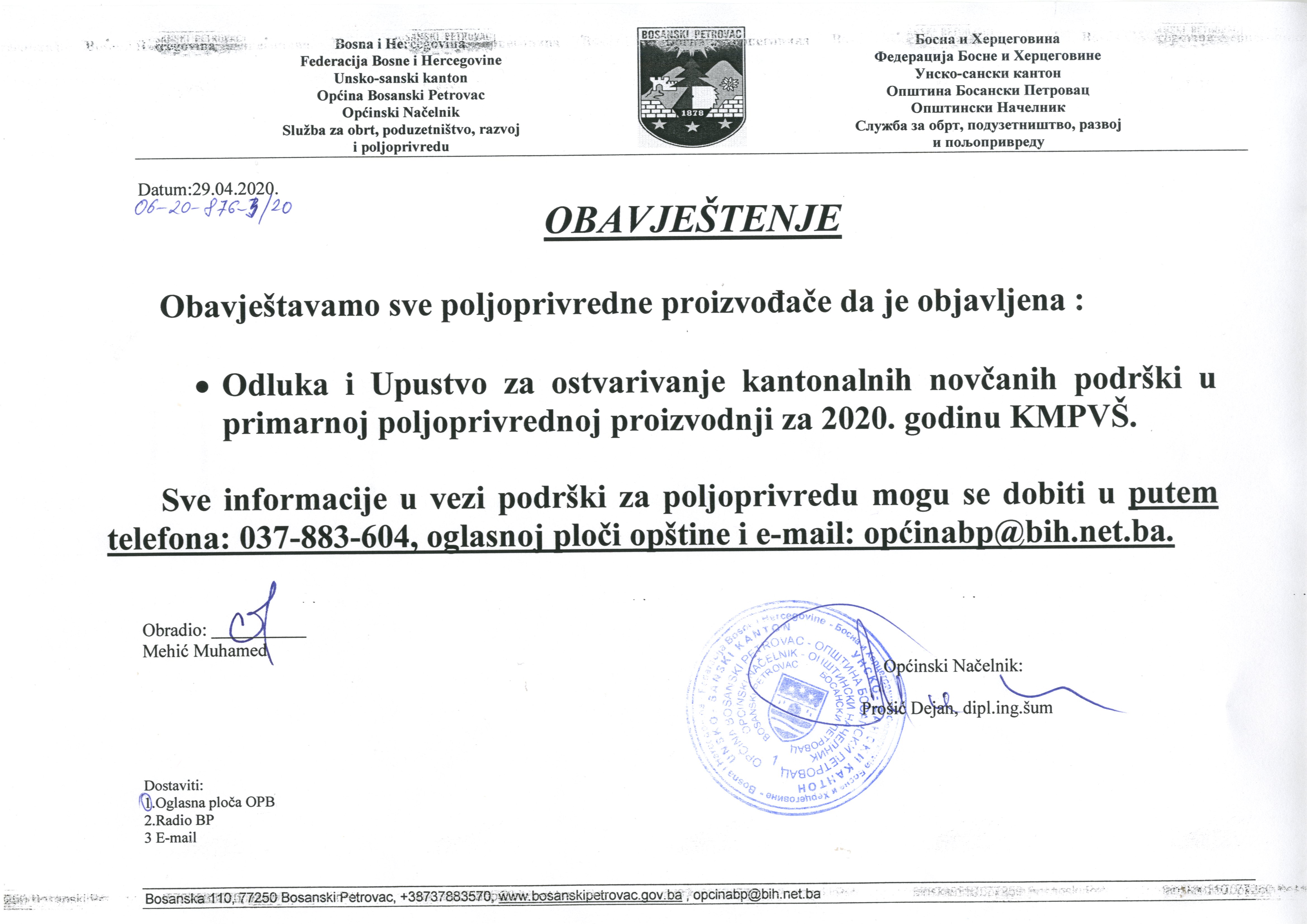 UPUSTVO ZA OSTVARIVANJE NOVČANIH PODRŠKI U PRIMARNOJ POLJOPRIVREDNOJ PROIZVODNJI ZA 2020. GODINU