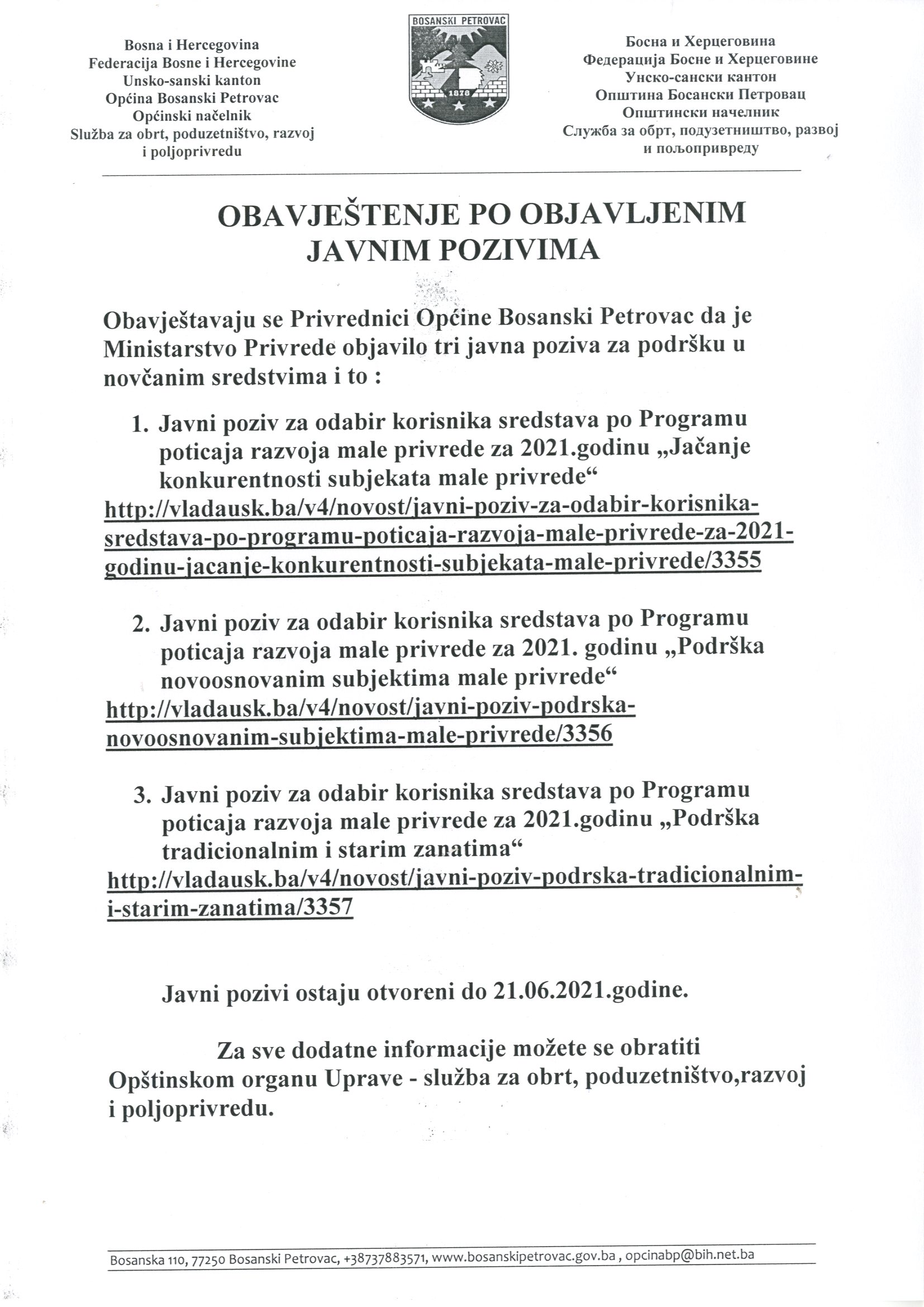 OBAVJEŠTENJE PO OBJAVLJENIM JAVNIM POZIVIMA