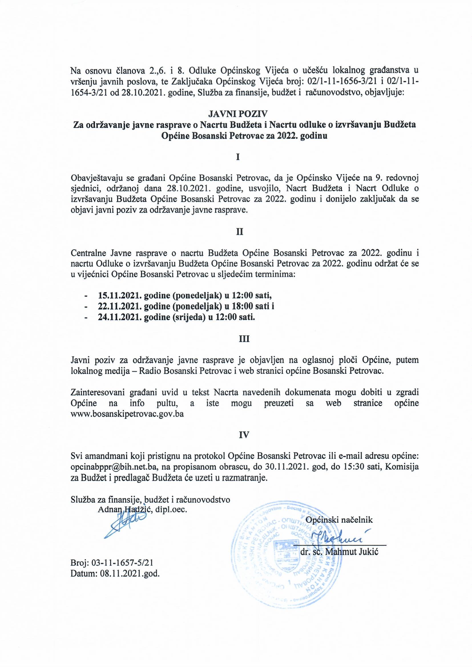 Obavještavaju se građani Općine Bosanski Petrovac, da je Općinsko Vijeće na 9. redovnoj sjednici, održanoj dana 28.10.2021. godine, usvojilo, Nacrt Budžeta i Nacrt Odluke o izvršavanju Budžeta Općine Bosanski Petrovac za 2022. godinu i donijelo zaključak da se objavi javni poziv za održavanje javne rasprave.