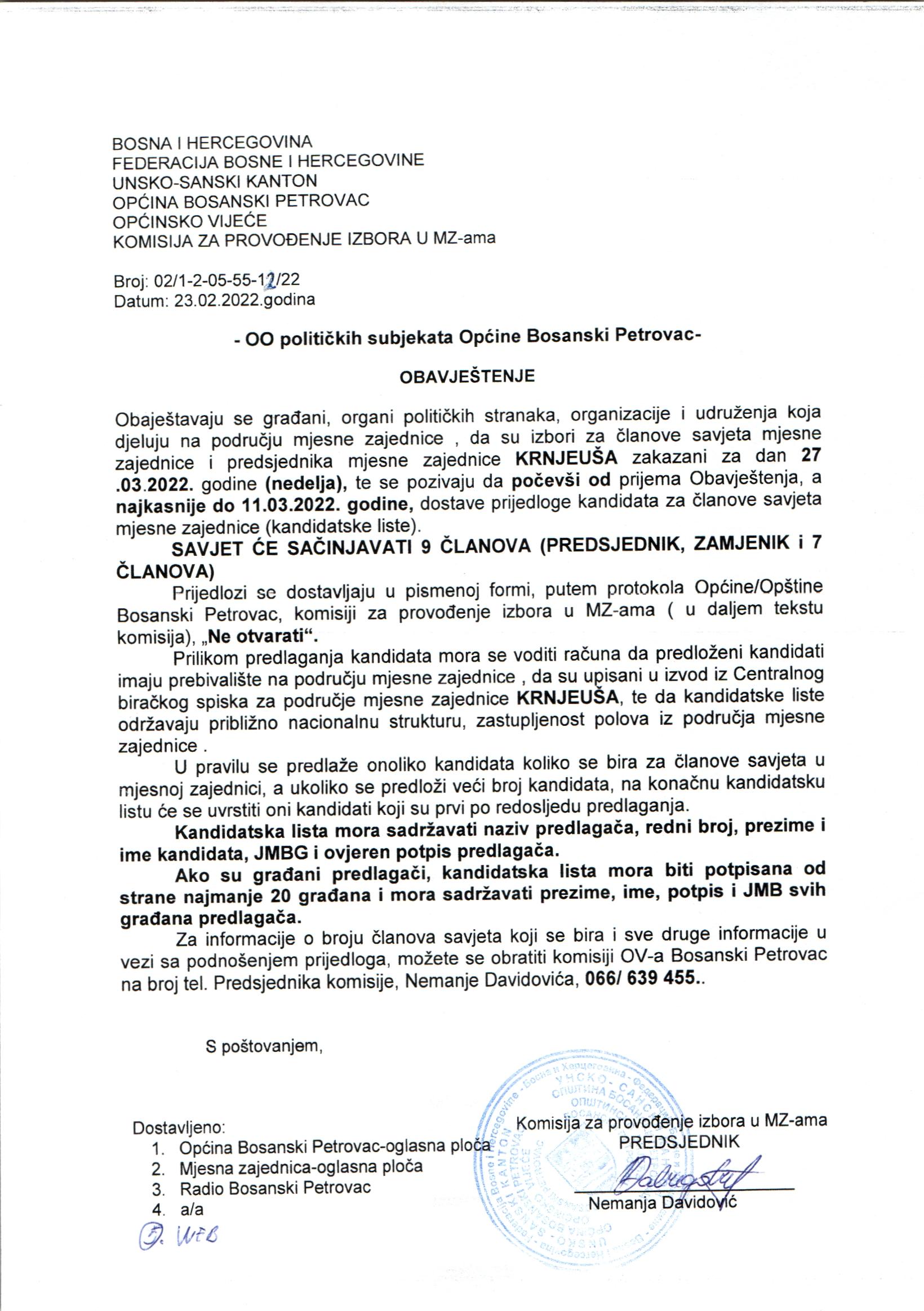 Obavještenje o izborima u MZ Krnjeuša