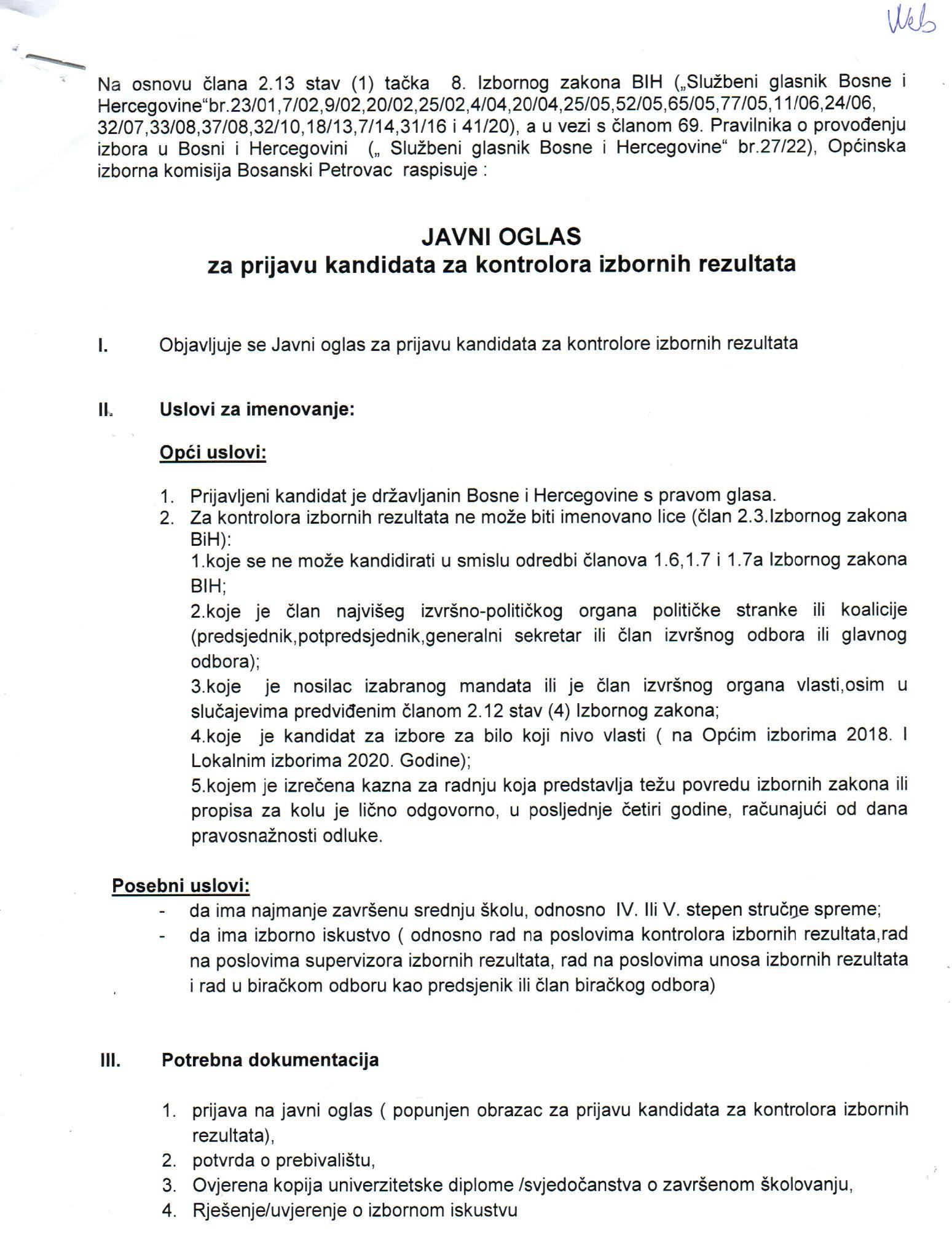 Javni oglas za prijavu kandidata za kontrolora izbornih rezultata