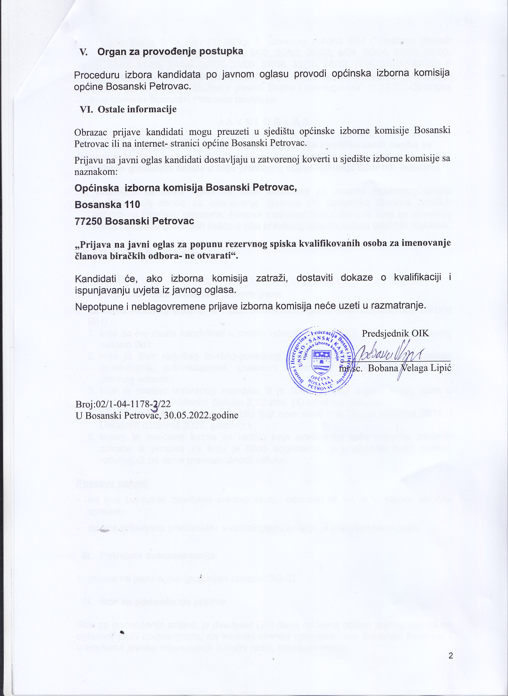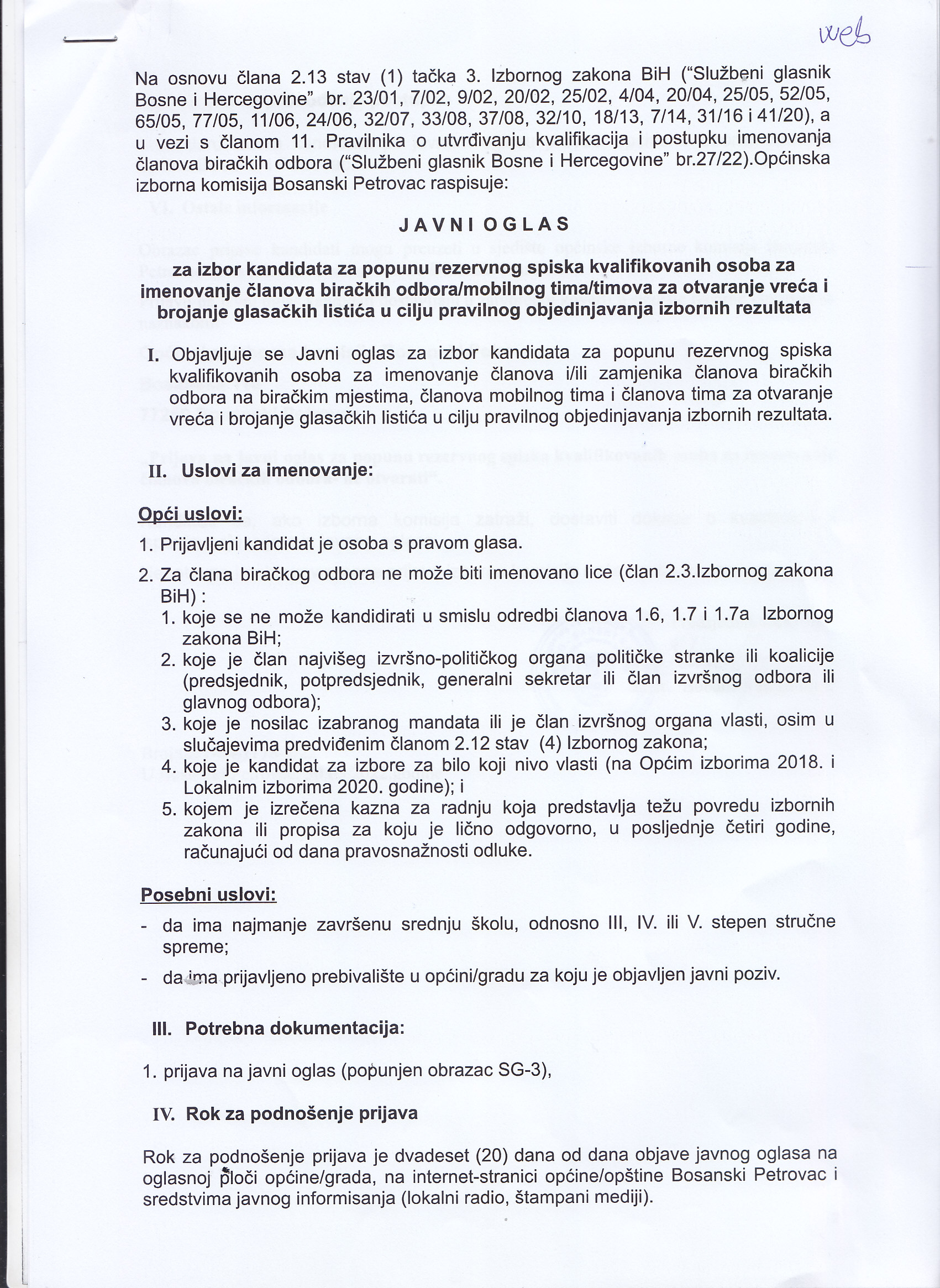 Javni oglas za izbor kandidata za popunjavanje rezervnog spiska kvalifikovanih osoba za imenovanje članova biračkih odbora