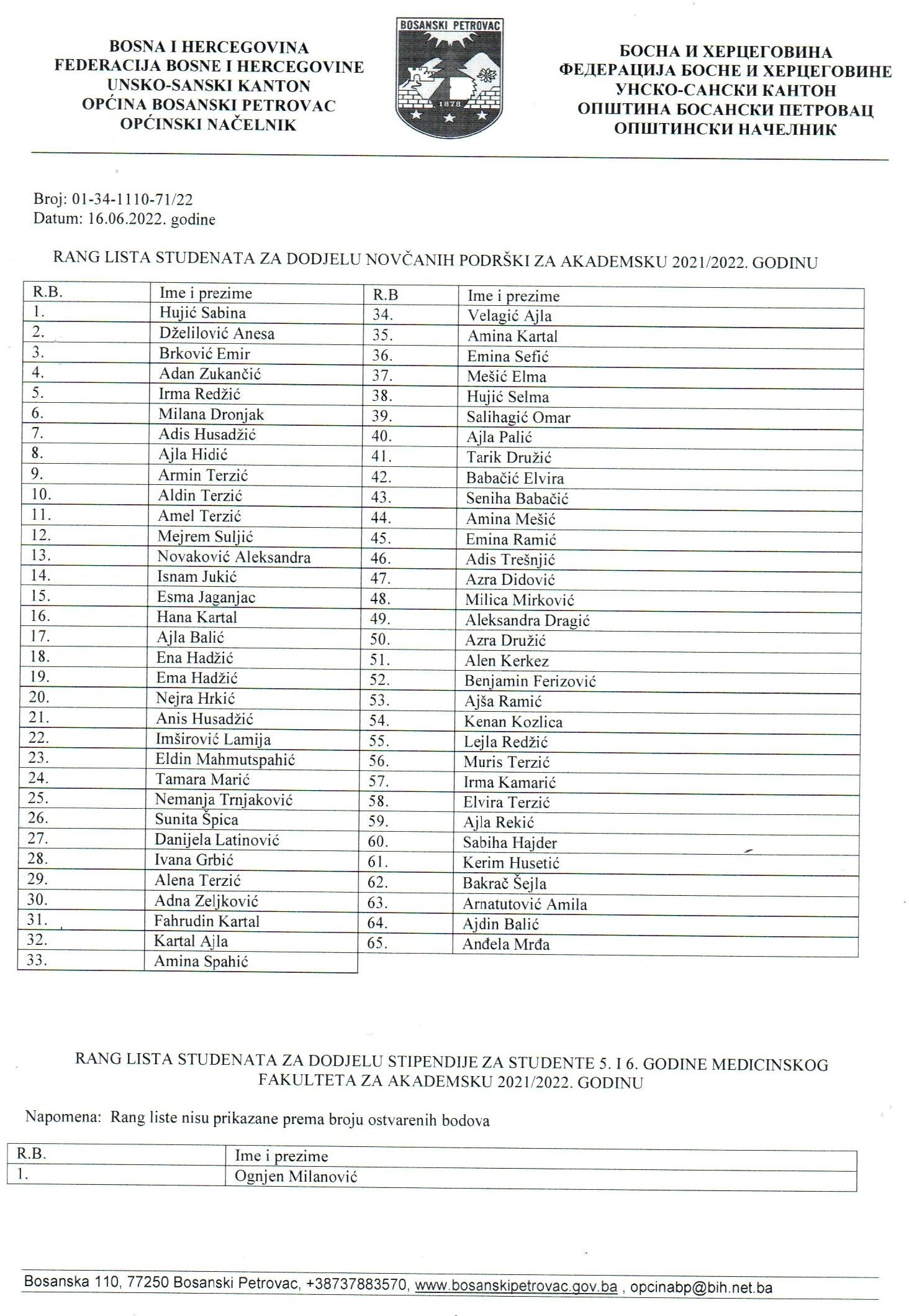 Rang lista studenata za dodjelu novčanih podrški i stipendija studentima za akademsku 2021/2022. godinu