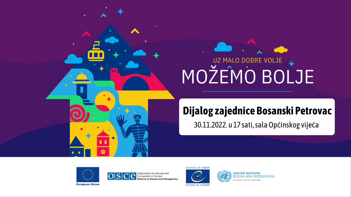 provedena u lokalnim zajednicama s konačnim ciljem jačanja povjerenja i društvene kohezije. „Dijalog zajednice Bosanski Petrovac“ održat će se 30. novembra 2022. godine, u sali Općinskog vijeća Bosanski Petrovac, s početkom u 17:00 sati. Zbog ograničenog broja mjesta, molimo sve zainteresirane da se registruju za učestovanje na dijalogu OVDJE