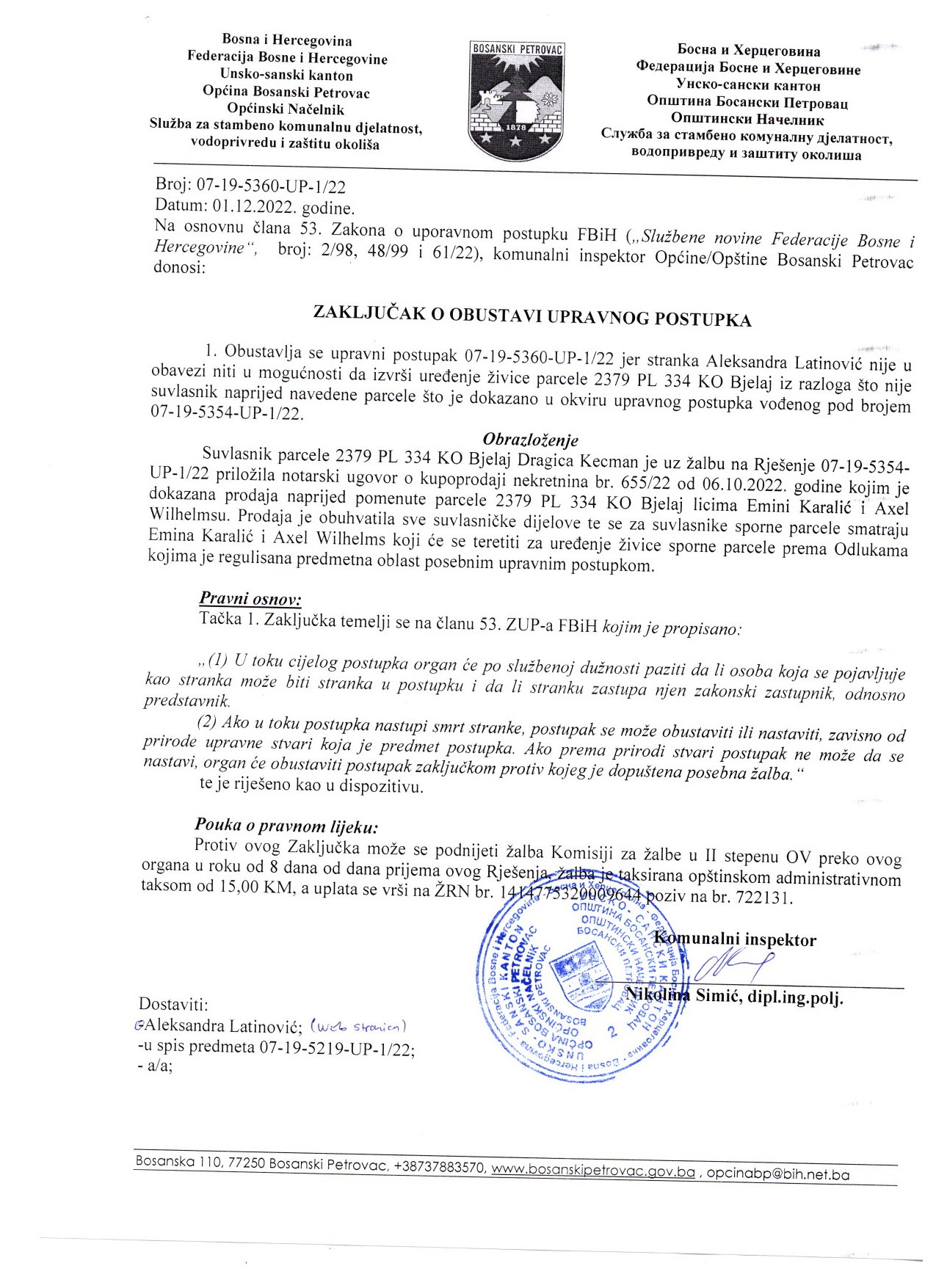 Zaključak o obustavi upravnog postupka Milijana Latinović- Stanković i Aleksandra Latinović