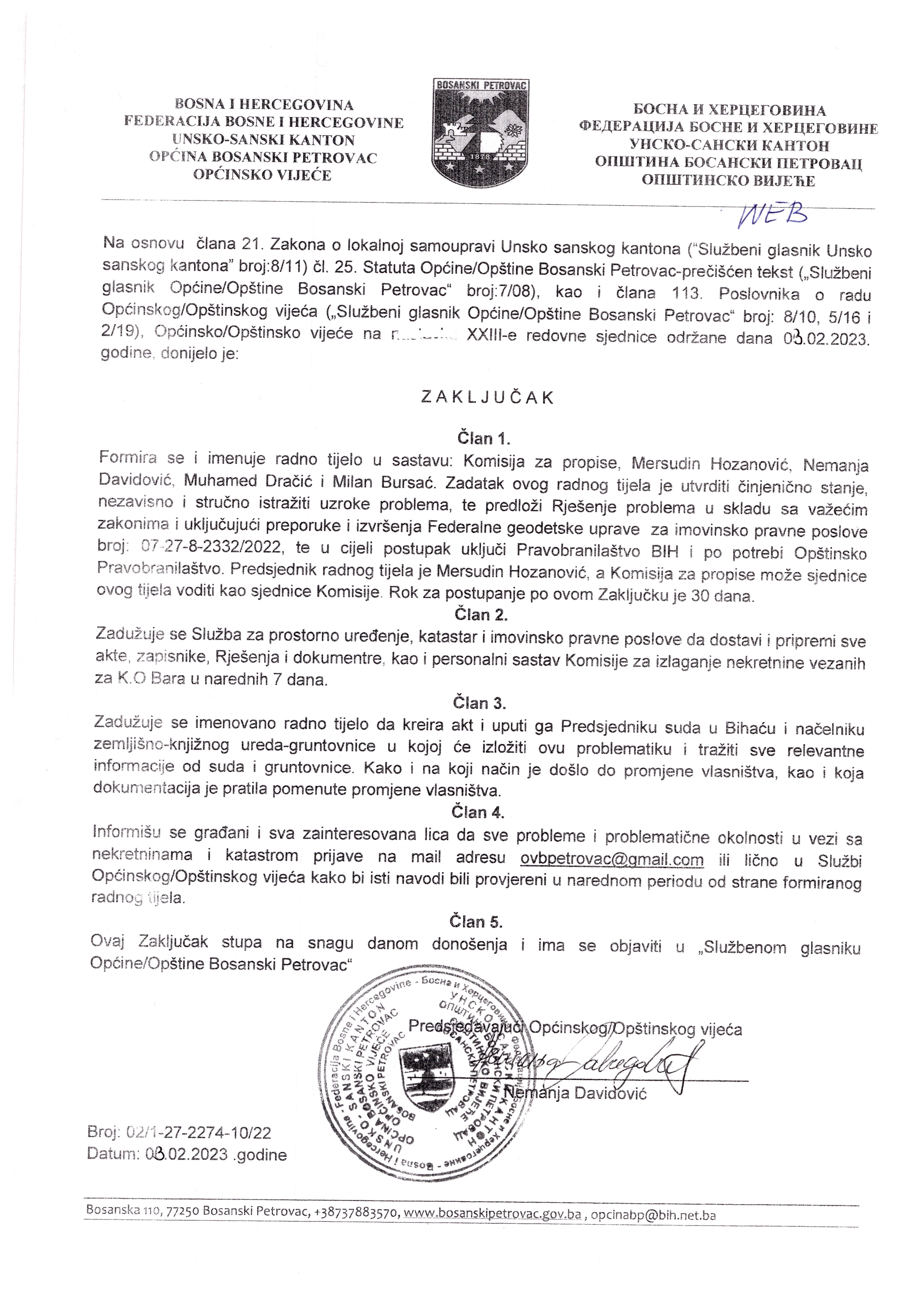 Zaključak Općinskog vijeća o formiranju radnog tijela