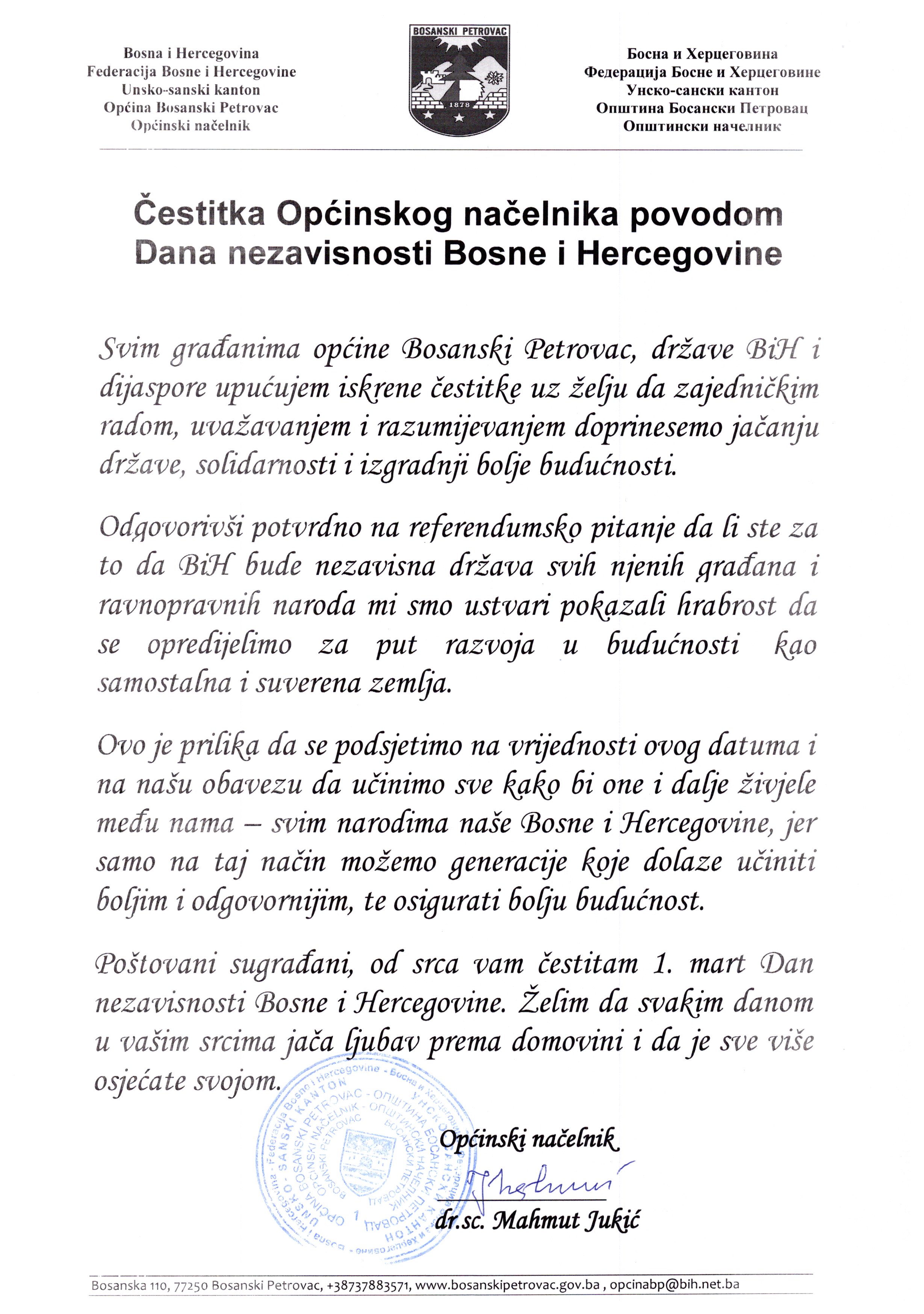 Čestitka Općinskog načelnika povodom Dana nezavisnosti Bosne i Hercegovine