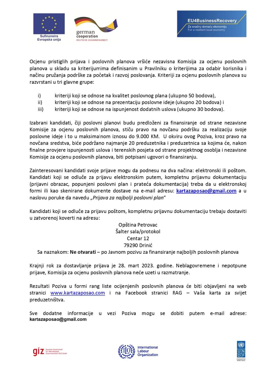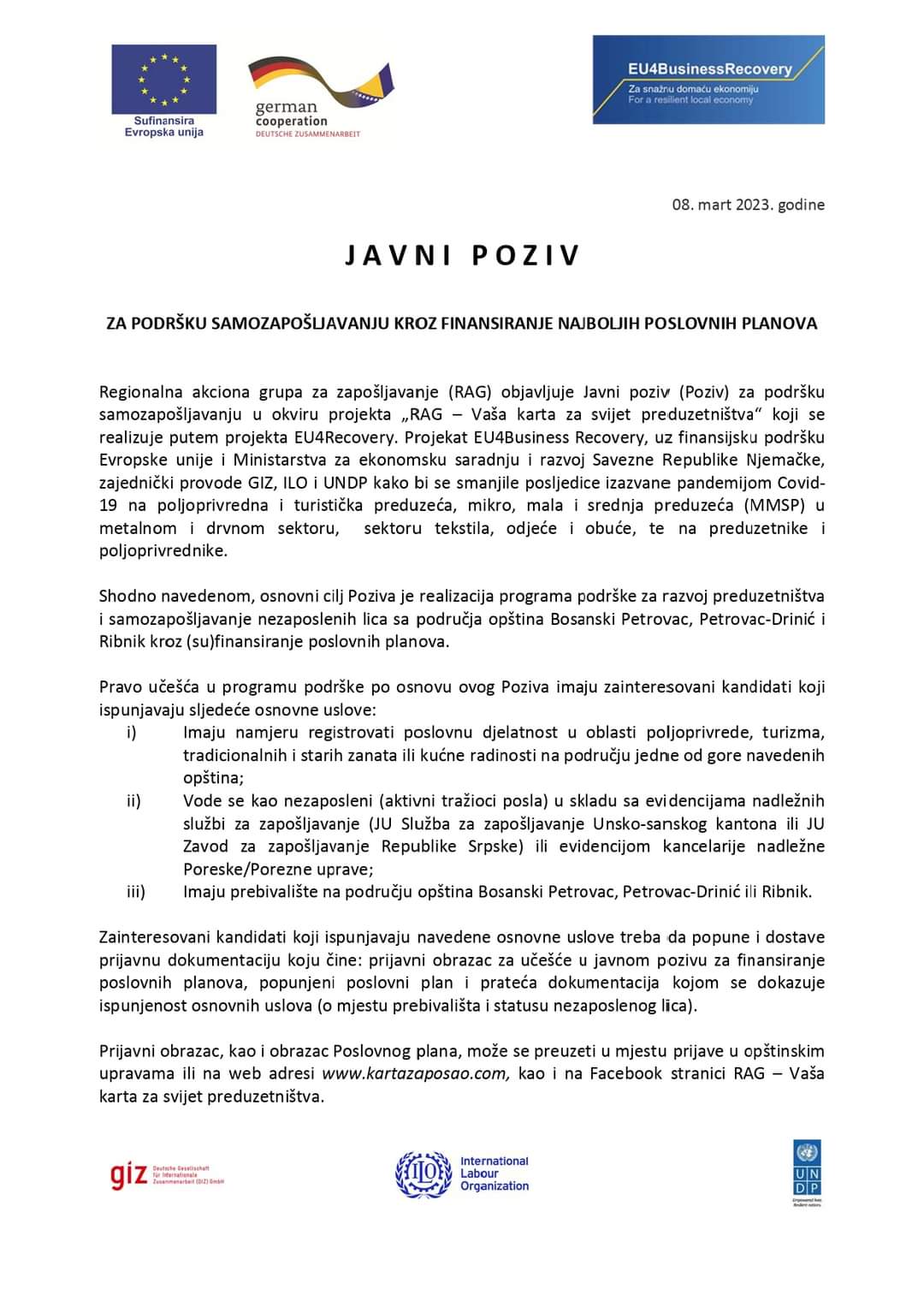 Obavještavamo vas da je raspisan Javni poziv za podršku samozapošljavanja kroz finansiranje najboljih poslovnih planova. Javni poziv je otvoren do 28.03.2023. Pravilnik o kriterijumima za odabir korisnika i načinu pružanja podrške za početak i razvoj poslovanja, kao i prijavni obrazac dostupan je na sljedećem linku: