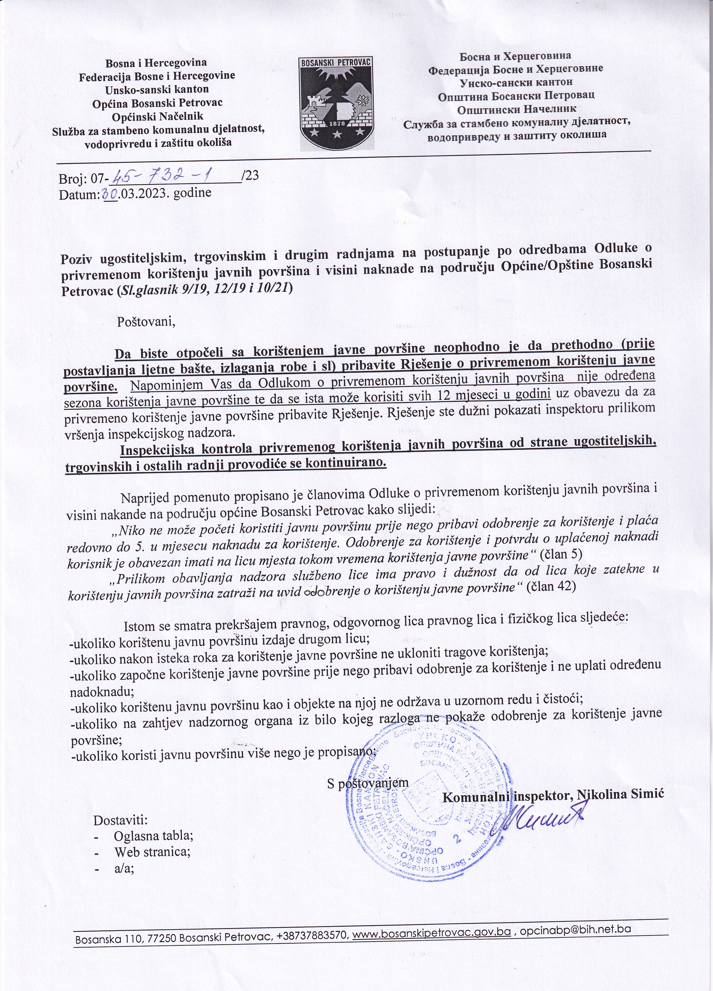 Poziv ugostiteljskim, trgovinskim i drugim radnjama na postupanje po odredbama Odluke o privremenom korištenju JP, komunalna inspekcija