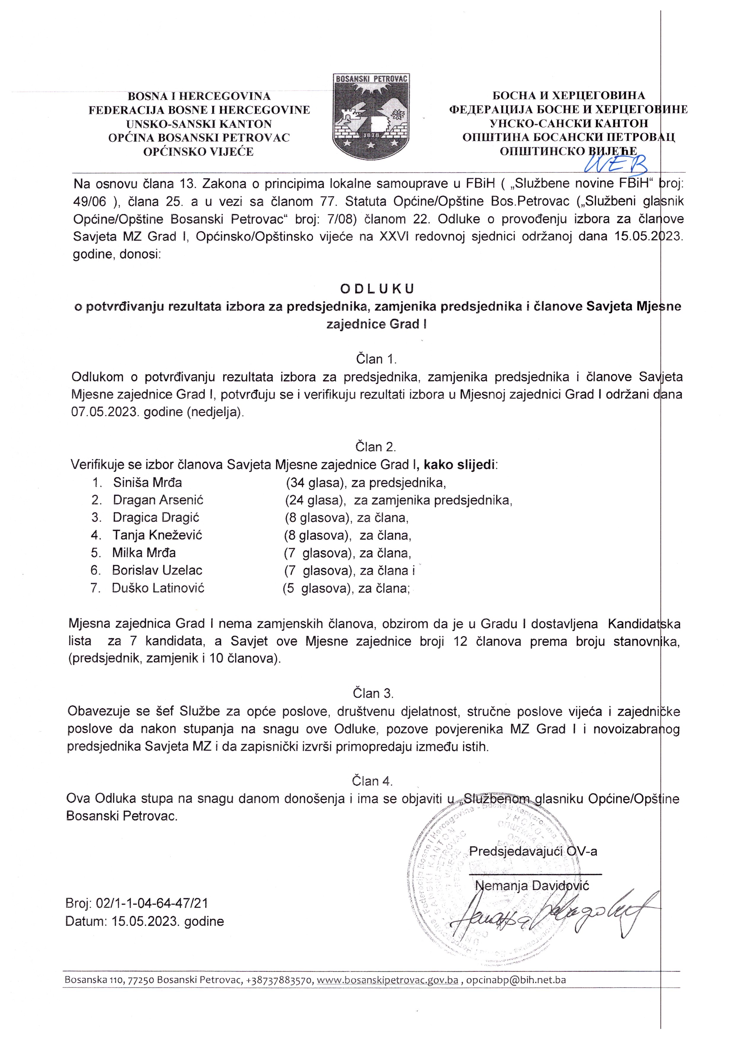 Odluka o potvrđivanju rezultata izbora MZ Grad I