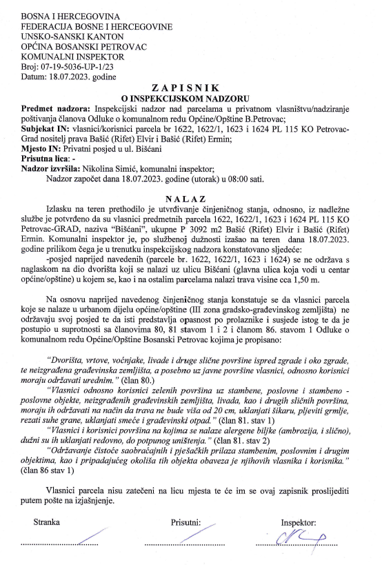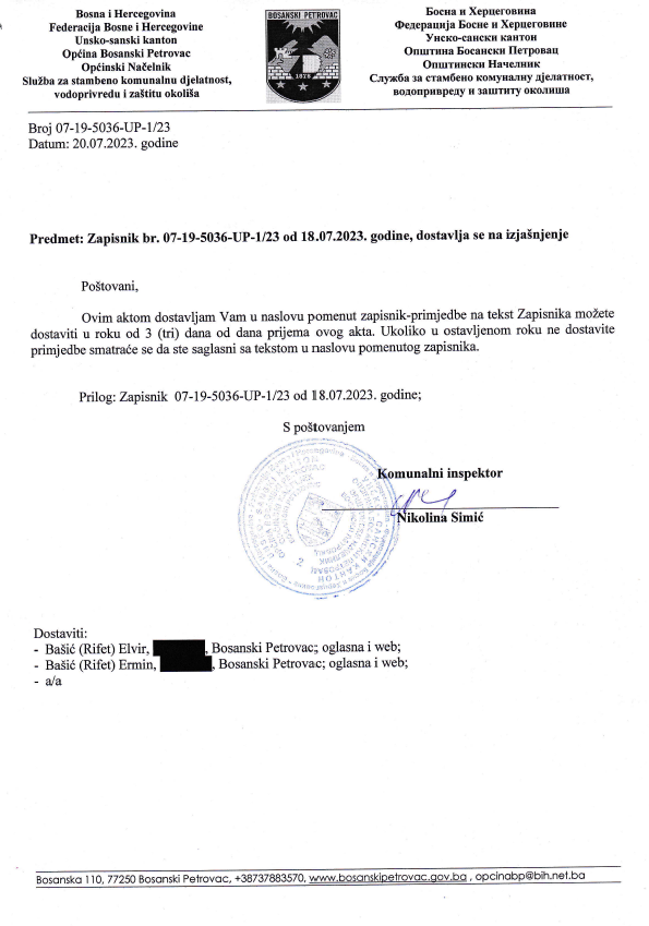 Zapisnik br. 07-19-5036-UP-1/23 od 18.07.2023. godine, dostavlja se na izjašnjenje Bašić (Rifet) Elvir i Bašić (Rifet) Ermin, komunalna inspekcija