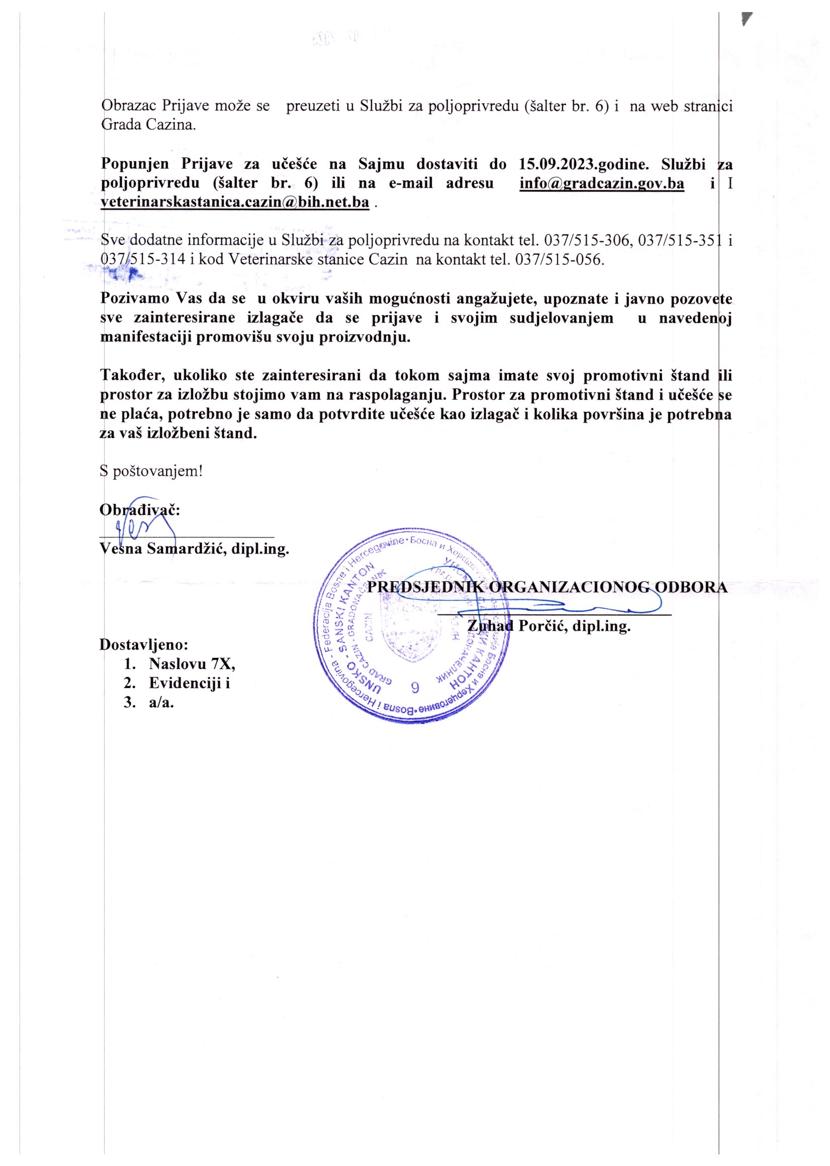 Obavijest o održavanju manifestacije "Cazinski sajam 2023" - XX kantonalne izložbe stočarstva