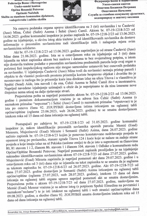 Rješenje br. 07-19-5183-UP-1/23 od 28.08.2023. godine dostavlja se Memić (Mensur) Esadu i Šehić (Juso) Ćamilu, komunalna inspekcija