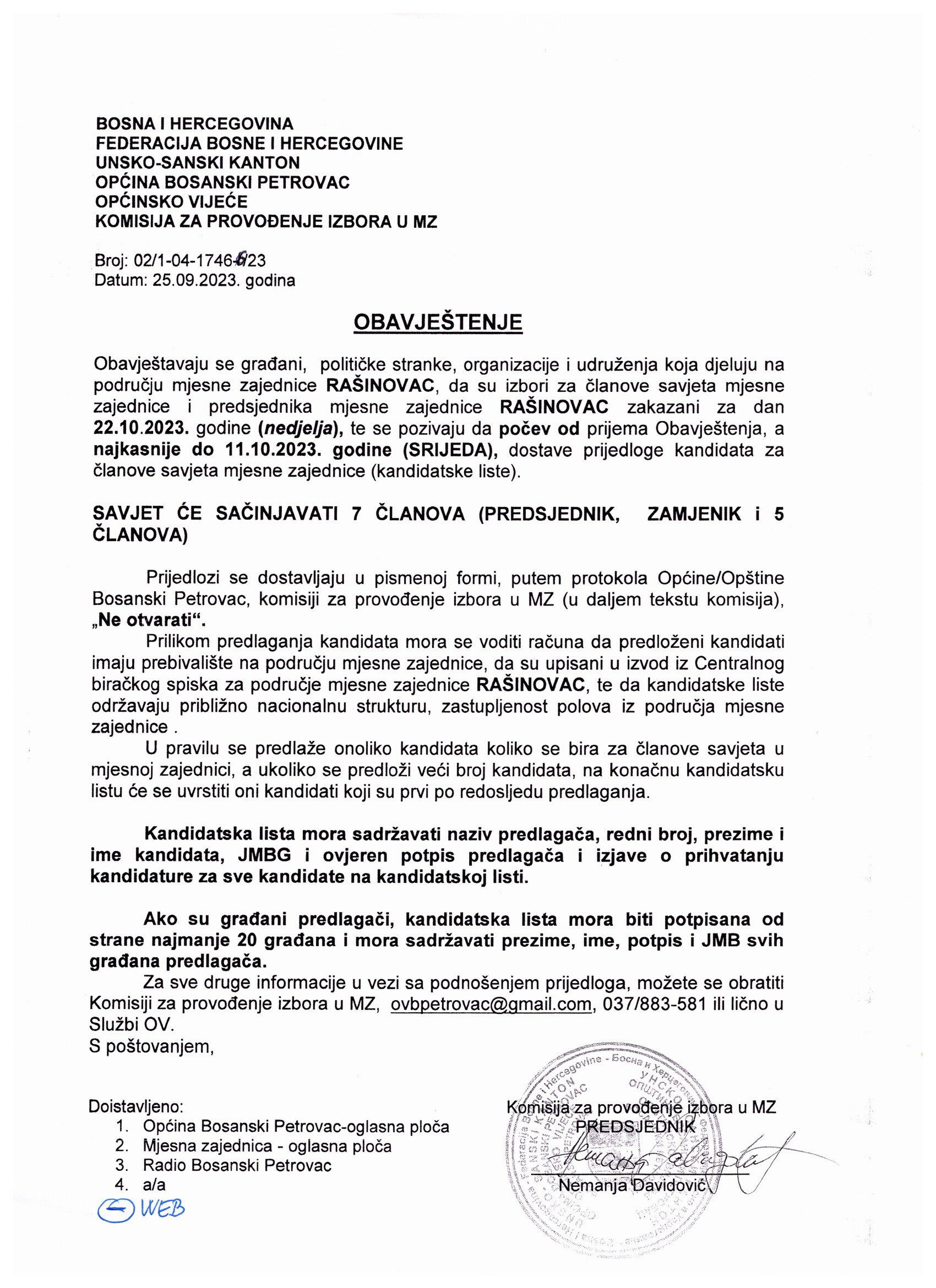 OBAVJEŠTENJE MZ RAŠINOVAC