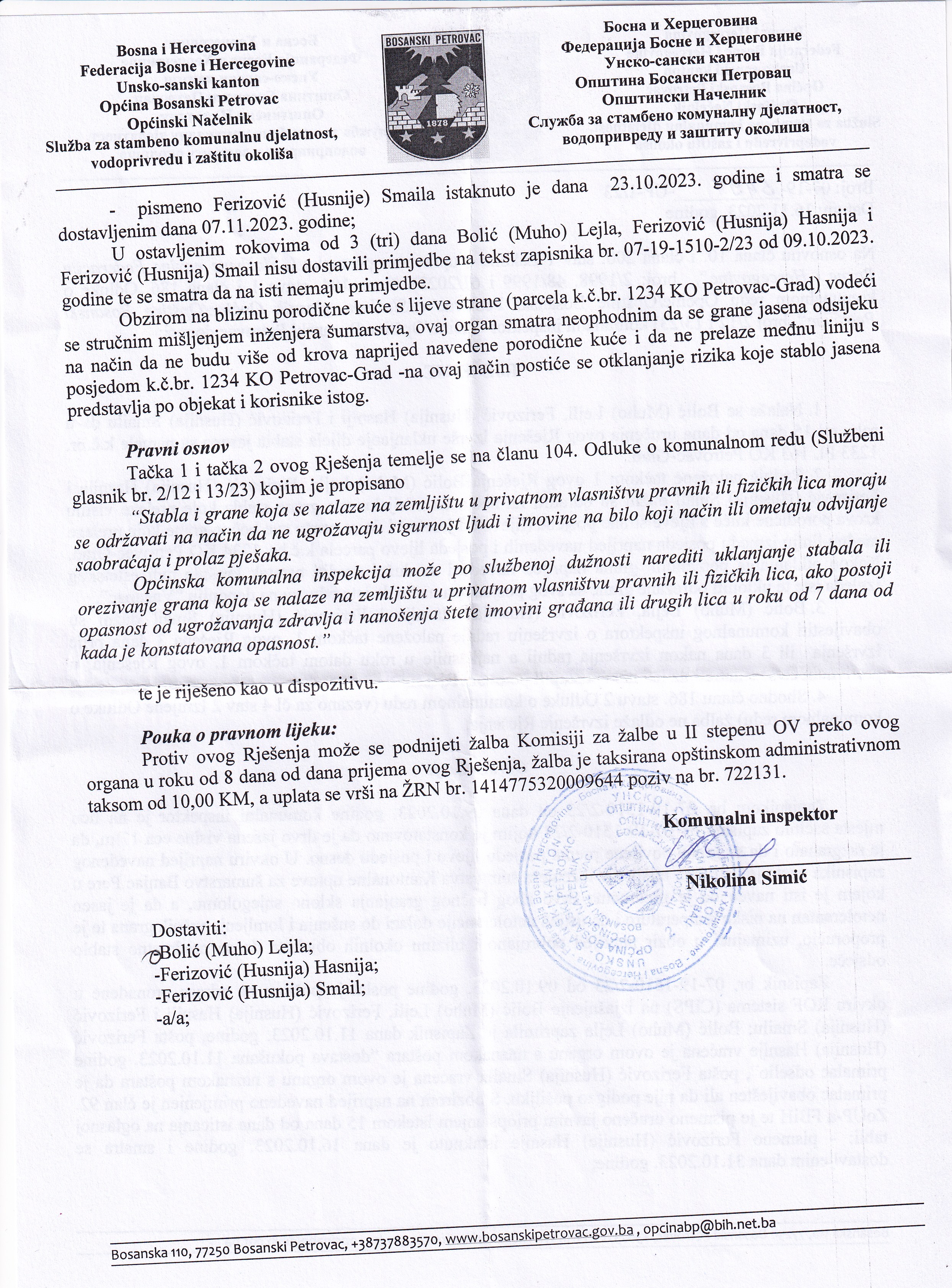 RJEŠENJE BR. 07-19-5497-UP-1/23 DOSTAVLJA SE BOLIĆ (MUHO) LEJLI, KOMUNALNA INSPEKCIJA