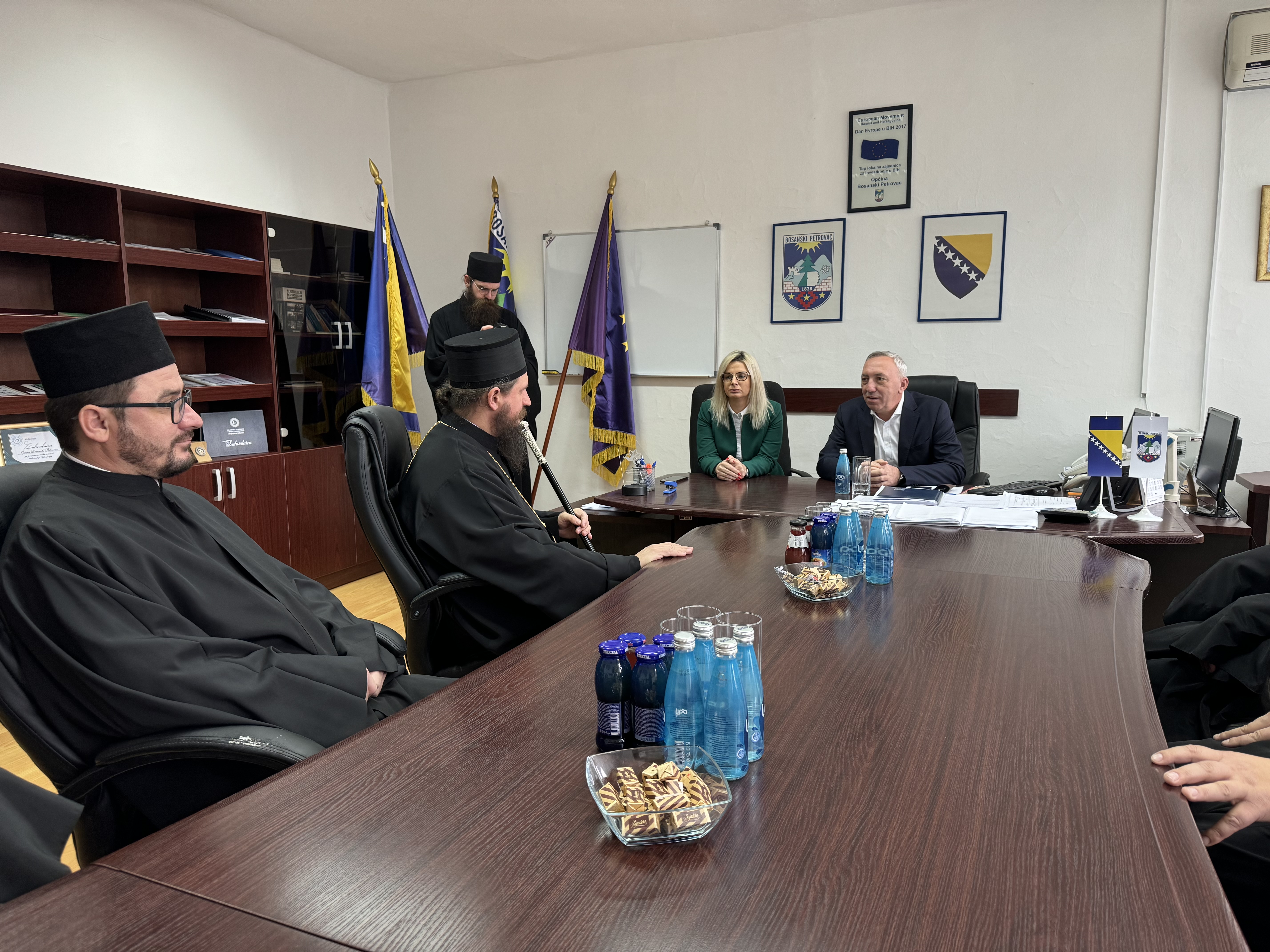 Danas je načelnik općine Bosanski Petrovac gospodin Mahmut Jukić upriličio prijem za Njegovo Preosveštenstvo Episkopa bihaćko-petrovačkog g. Sergija i sveštenstvo parohija petrovačkih povodom Božića. Ovo je bila prilika da načelnik općine Bosanski Petrovac gostima čestita predstojeće praznike, a zatim da se razgovaralo o saradnji između općine i Pravoslavne crkve.