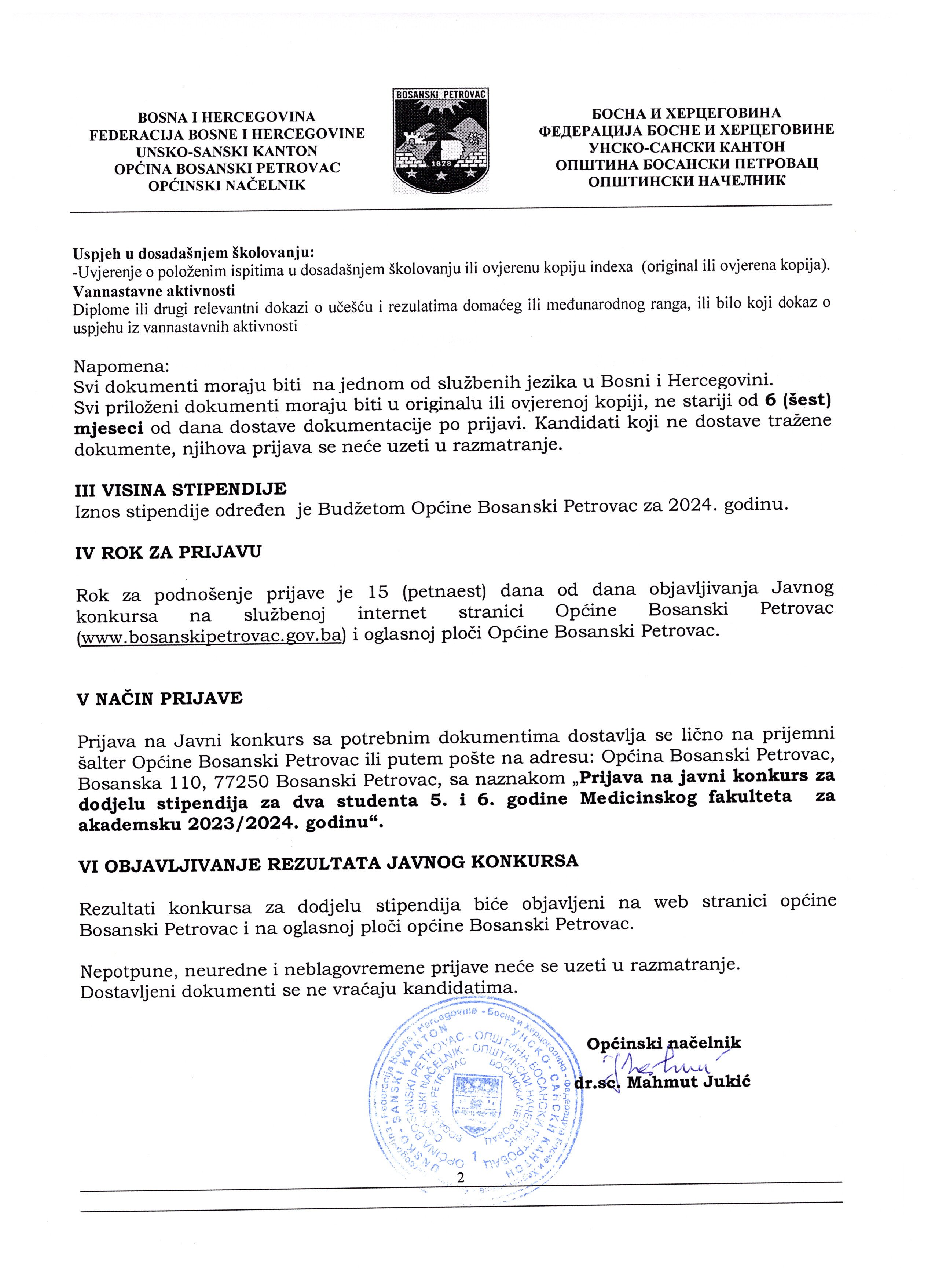 JAVNI KONKURS ZA DODJELU STIPENDIJA ZA DVA STUDENTA 5. I 6. GODINE MEDICINSKOG FAKULTETA ZA AKADEMSKU 2023/2024. GODINU