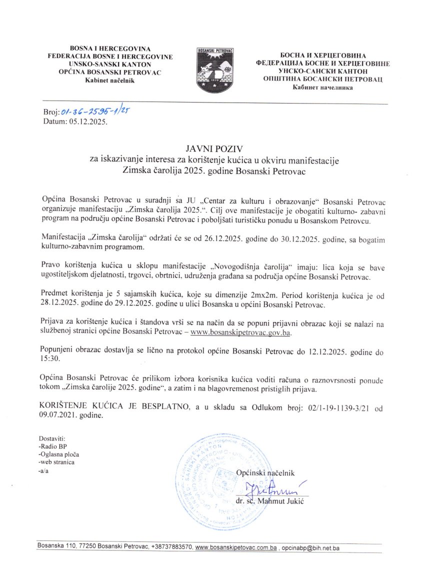 JAVNI POZIV - korištenje kućica u sklopu manifestacije Zimska čarolija 2025.