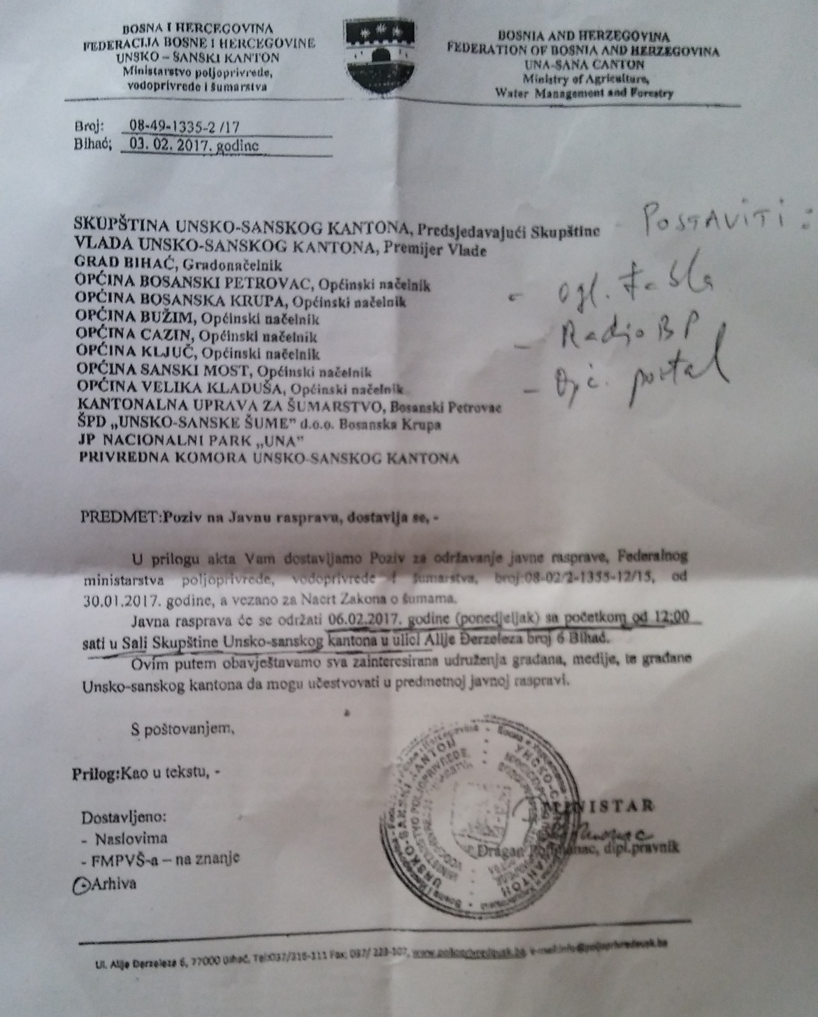 Javna rasprava o Nacrtu Zakona o šumama održat će se u ponedeljak 06.02.2017. godine, sa početkom u 12:00 sati u Sali skupštine USK-a.