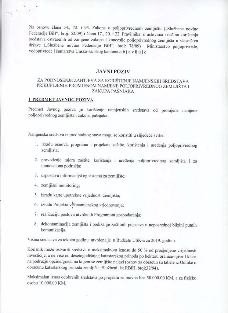 Javni poziv za podnošenje zahtjeva za korištenje namjenskih sredstava prikupljenih promjenom namjene poljoprivrednog zemljišta i zakupa pašnjaka