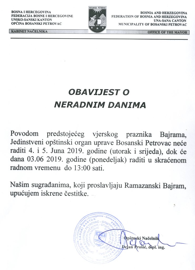 Obavijest o neradnim danima