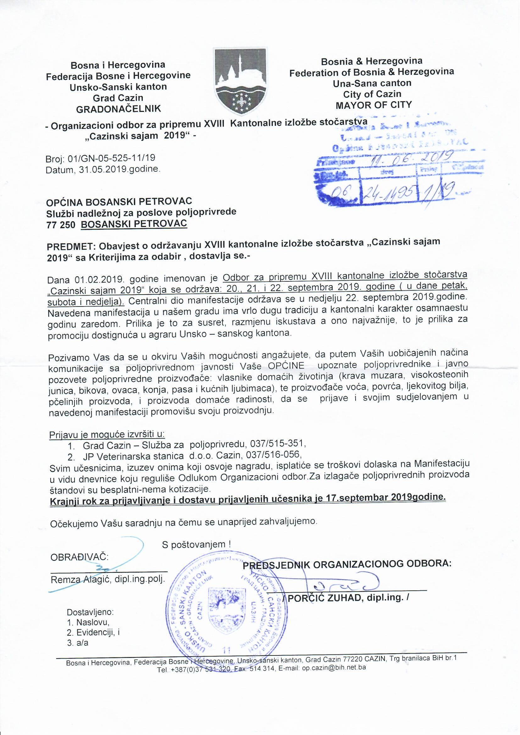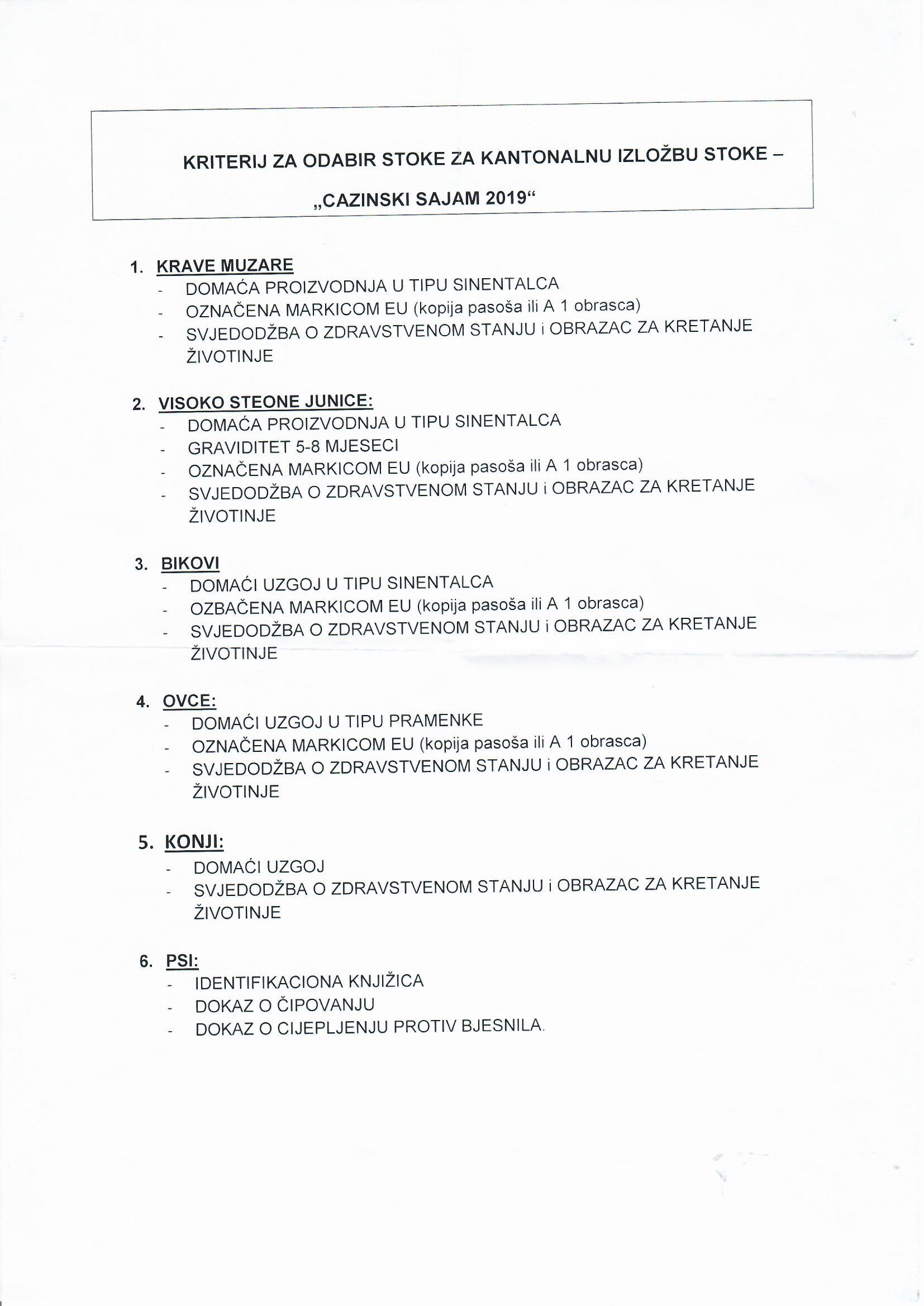 Obavijest o održavanju XVIII Kantonalne izložbe stočarstva "Cazinski sajam 2019" sa kriterijima za odabir