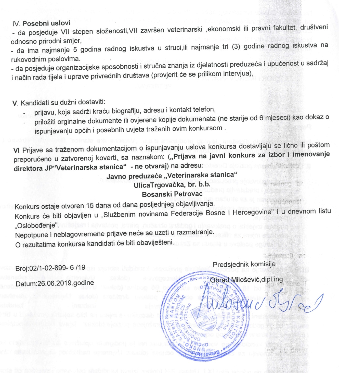 Javni konkurs za izbor i imenovanje direktora JP Veterinaska stanica
