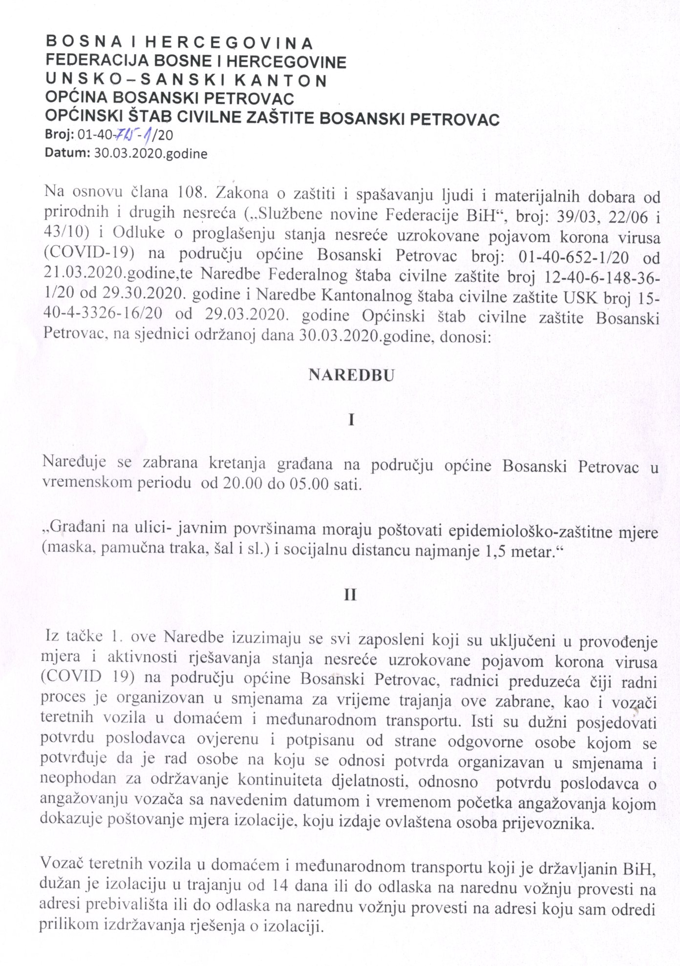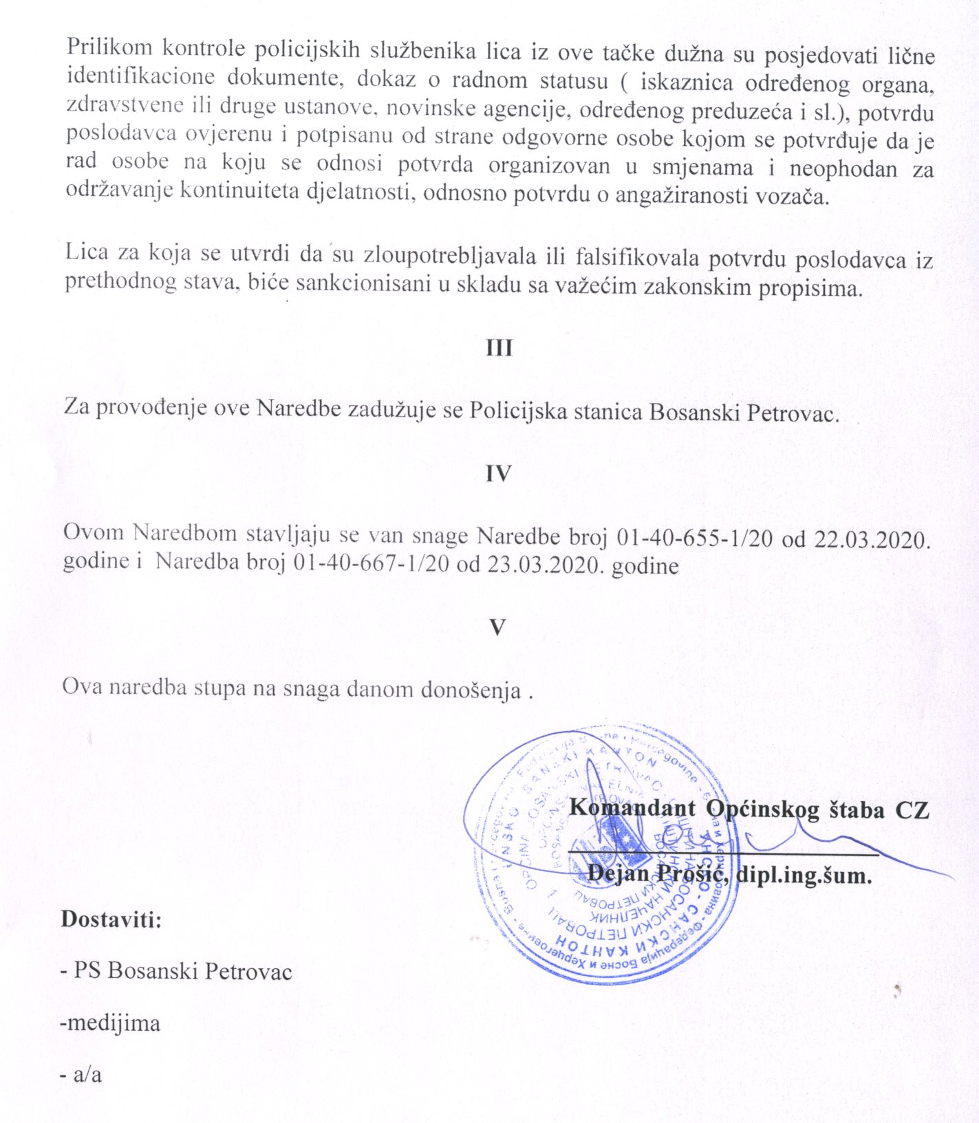 Naredba Štaba civilne žaštite, 30.03.2020.god.