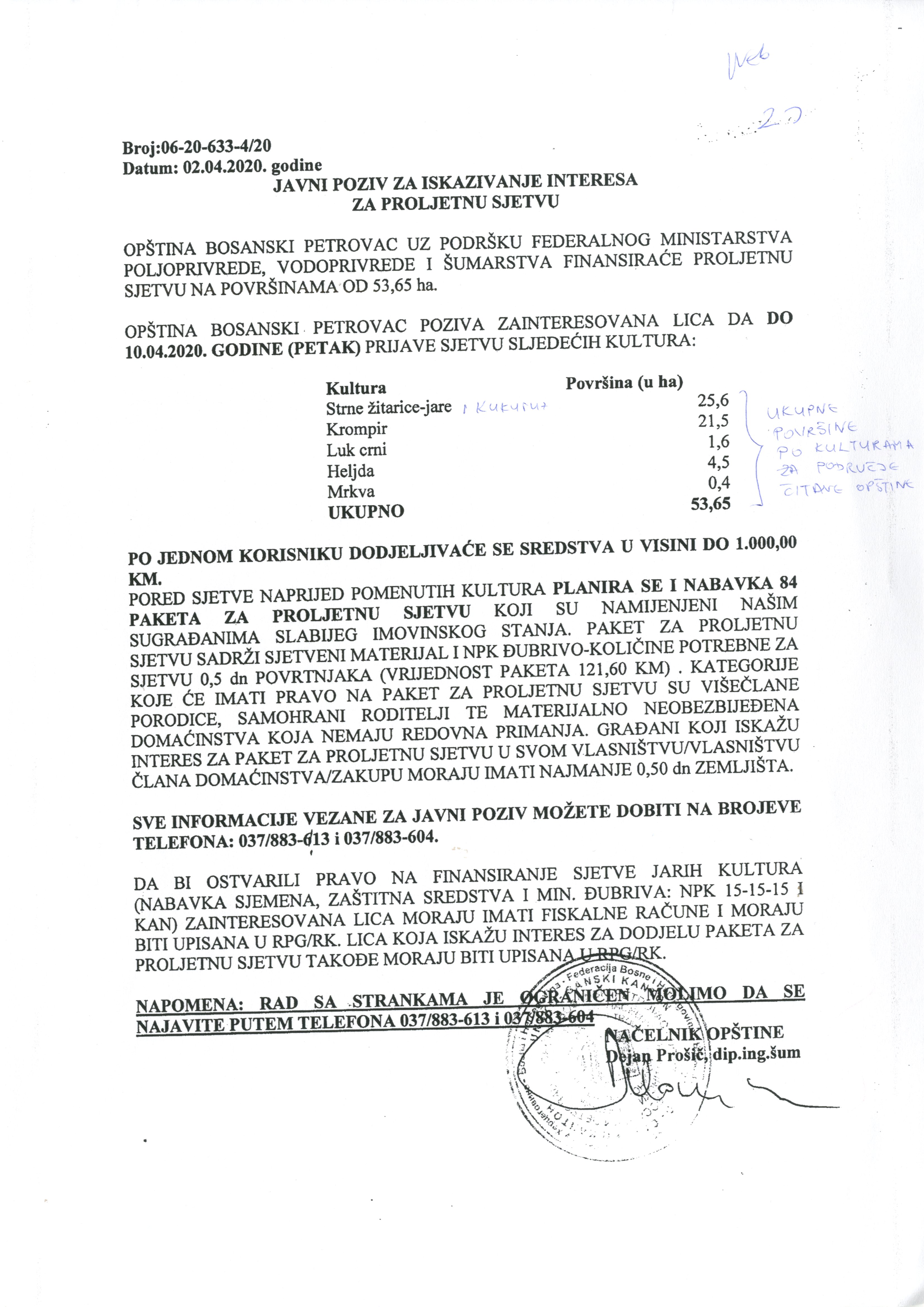 Javni poziv za iskazivanje interesa za poljoprivrednu sjetvu