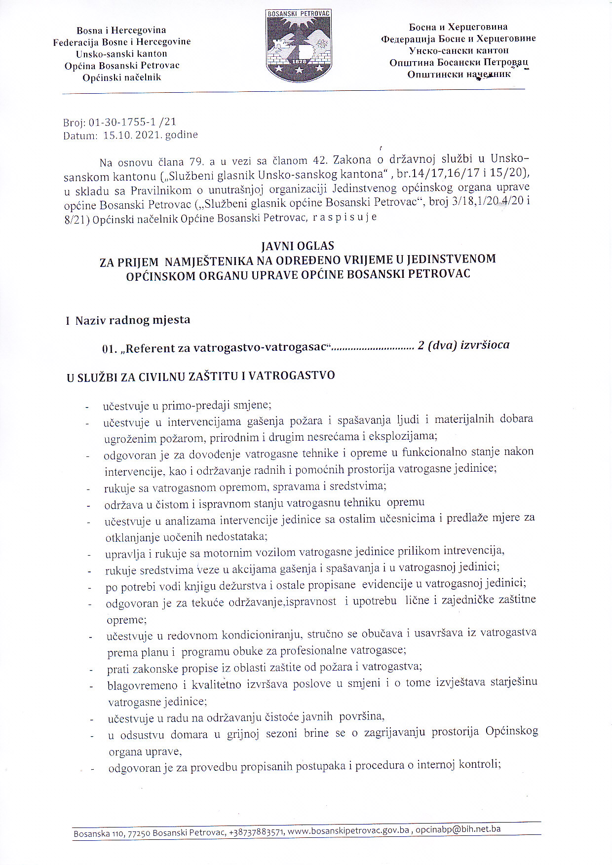 JAVNI OGLAS OBJAVLJEN NA WEB STRANICI 15.10.2021. GODINE
