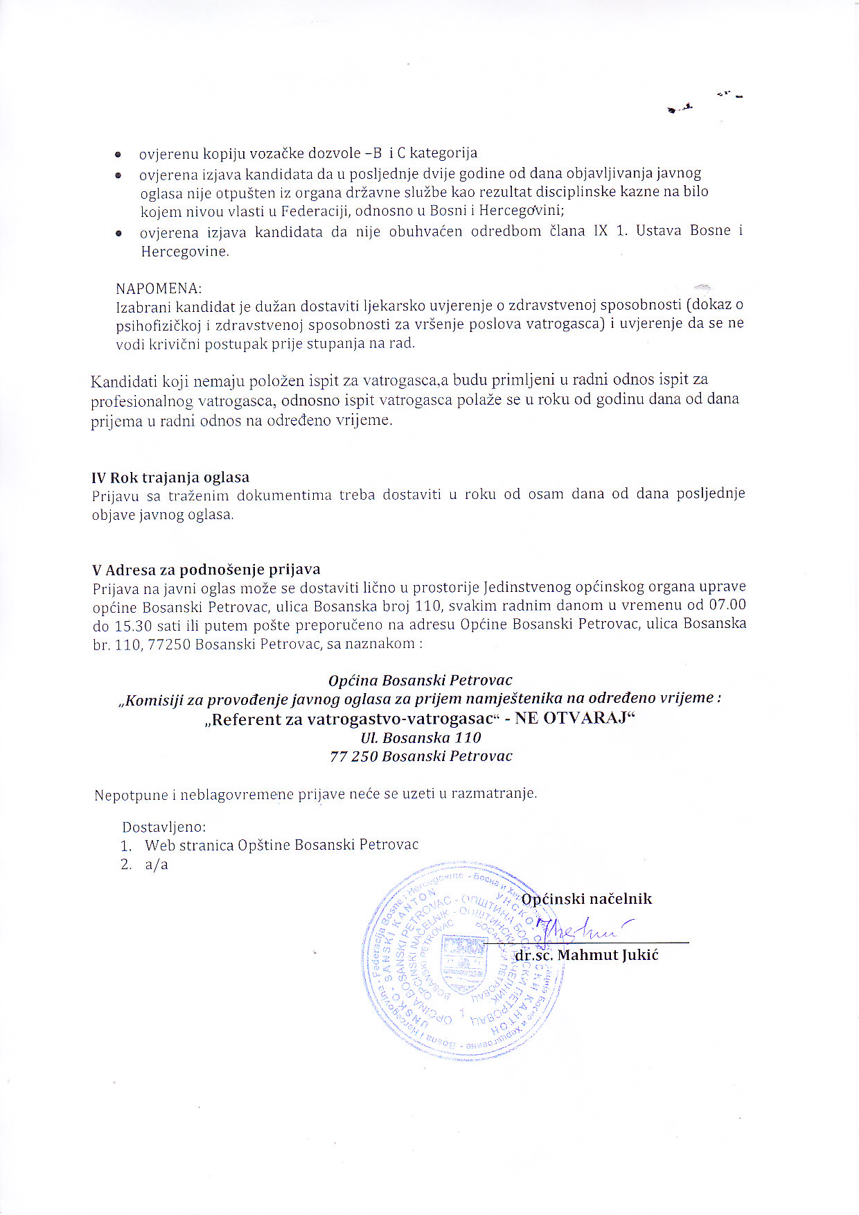 Javni oglas za prijem namještenika na određeno vrijeme u jedinstvenom općinskom organu uprave općine Bosanski Petrovac