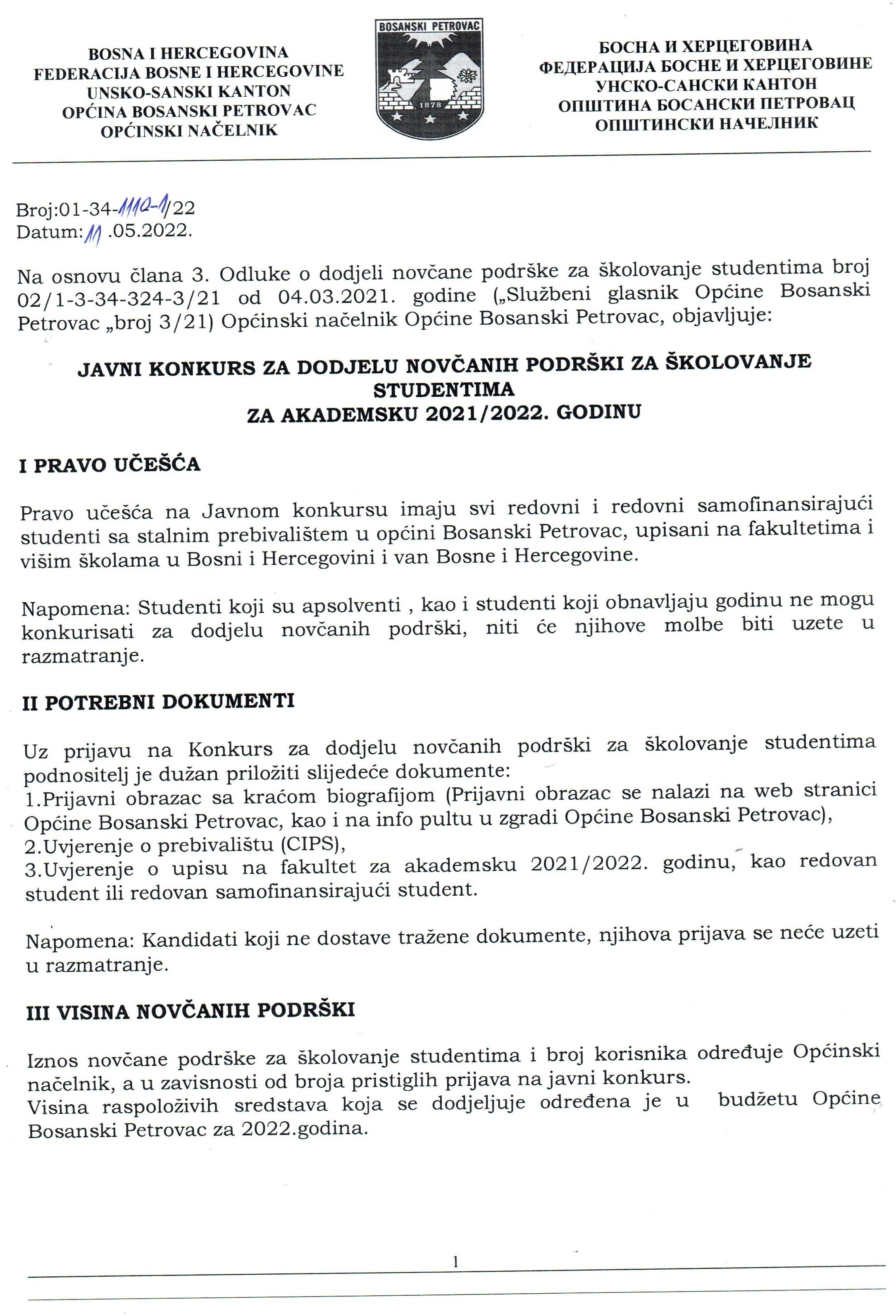 JAVNI KONKURS ZA DODJELU NOVČANIH PODRŠKI ZA ŠKOLOVANJE STUDENTIMA ZA AKADEMSKU 2021/2022. GODINU