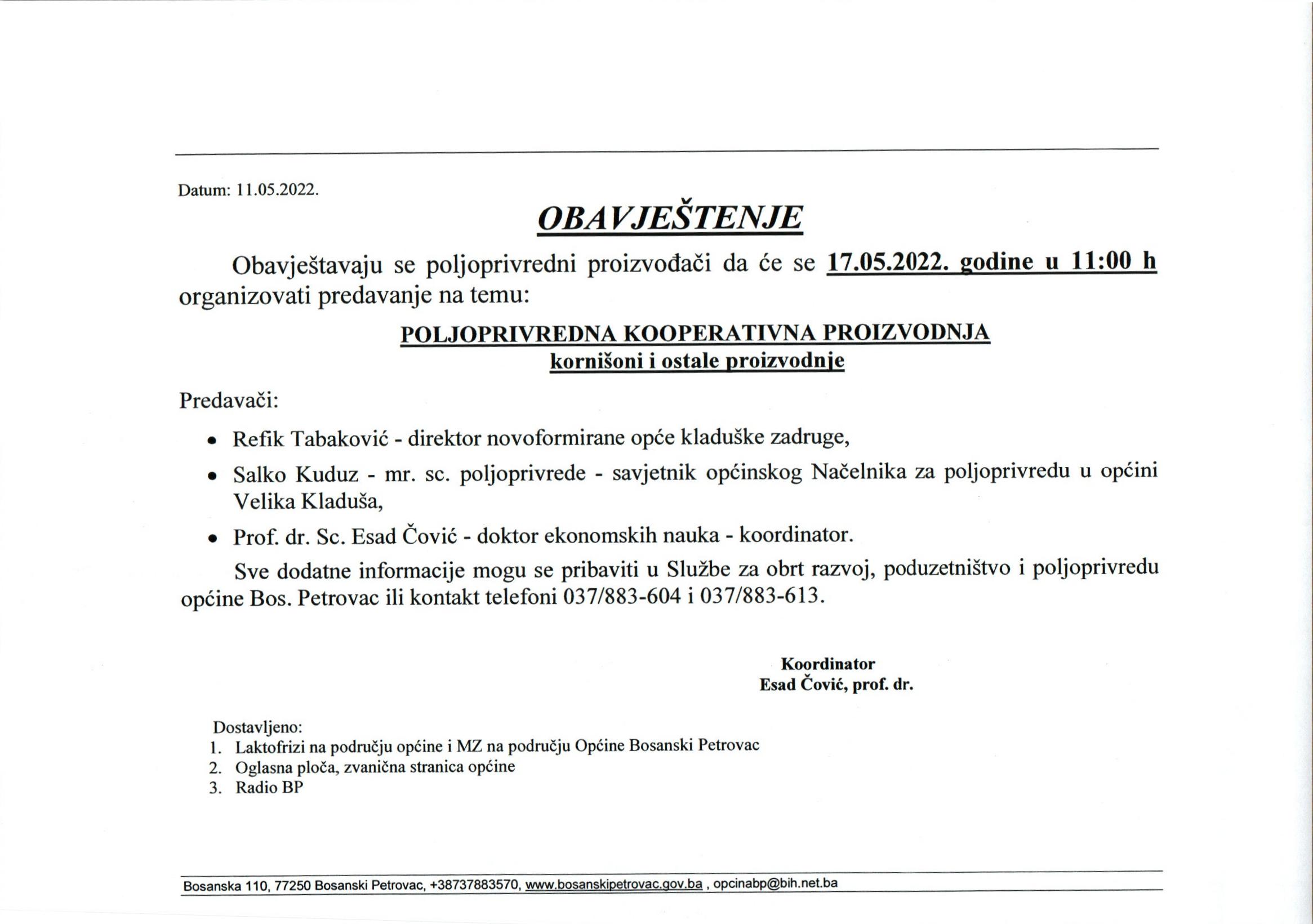 Obavještenje za poljoprivredne proizvođače