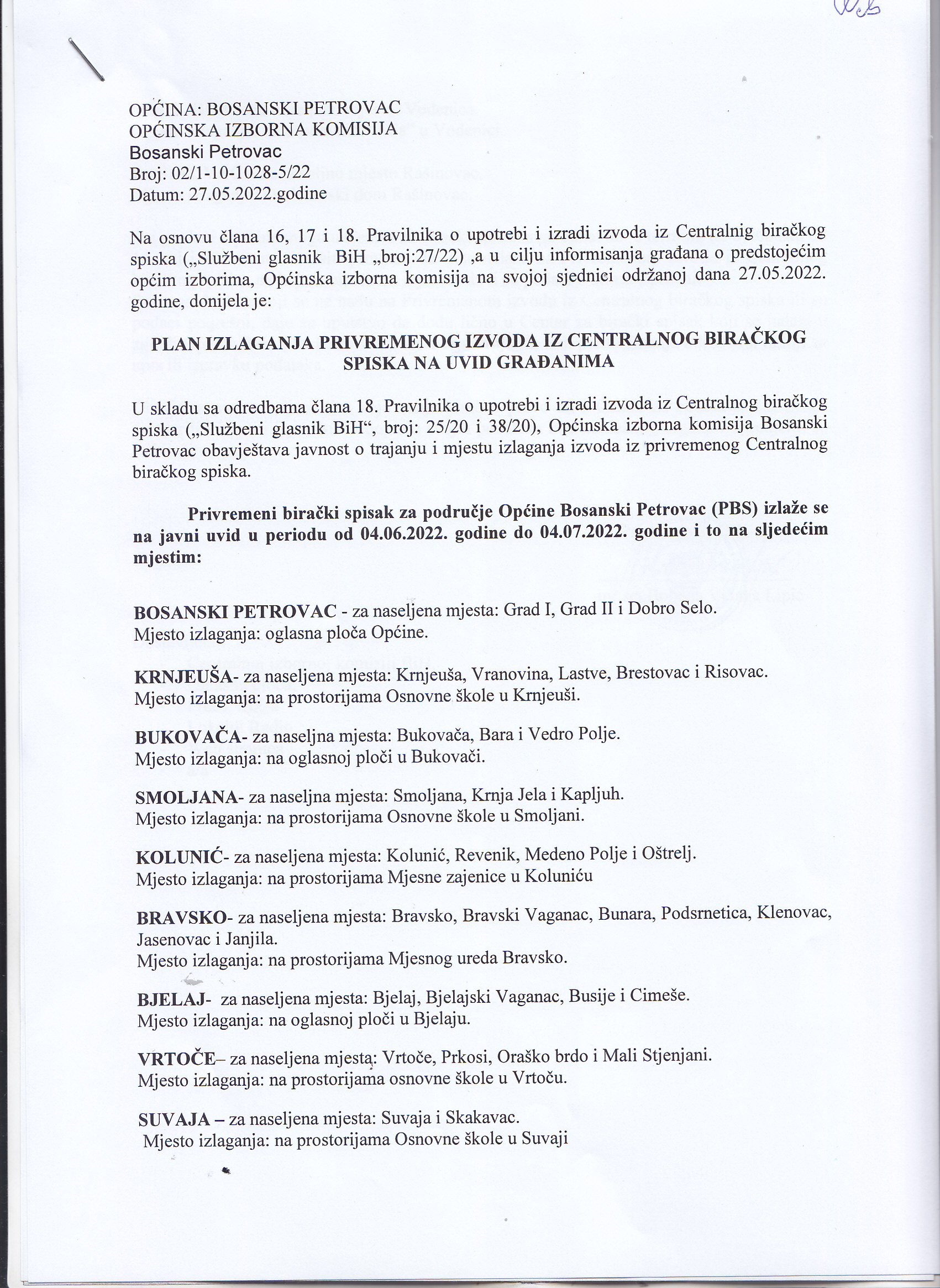 Plan izlaganja privremenog izvoda iz centralnog biračkog spiska na uvid građanima