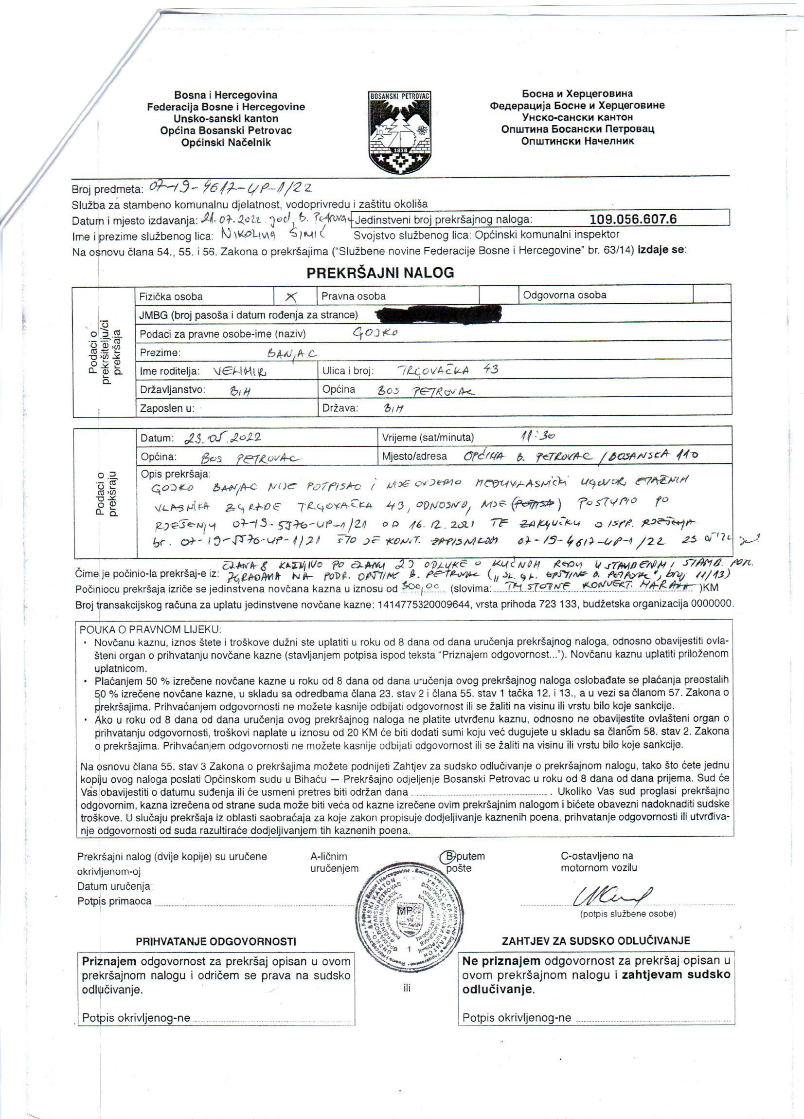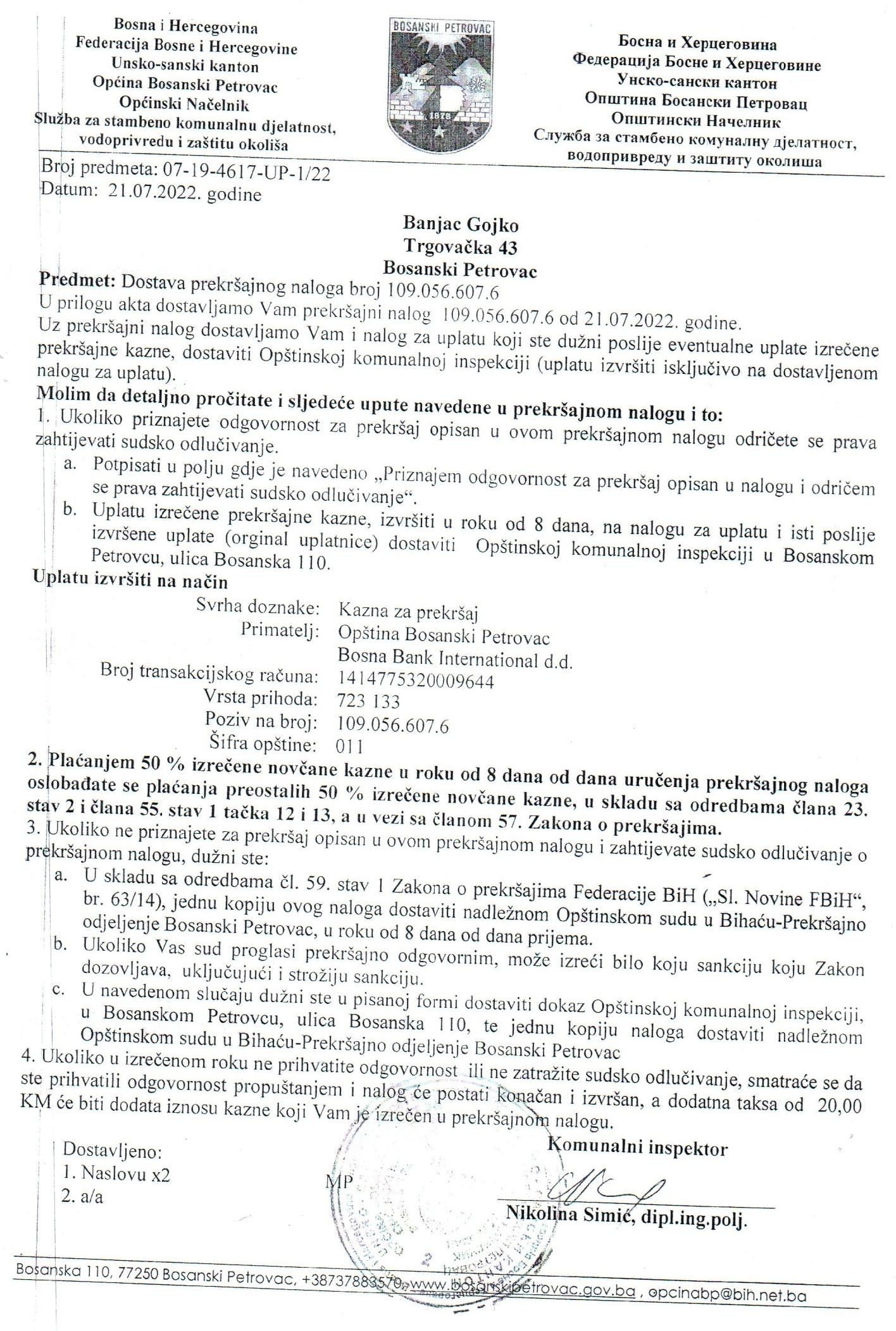 Prekršajni nalog Gojko Banjac, dostavlja se