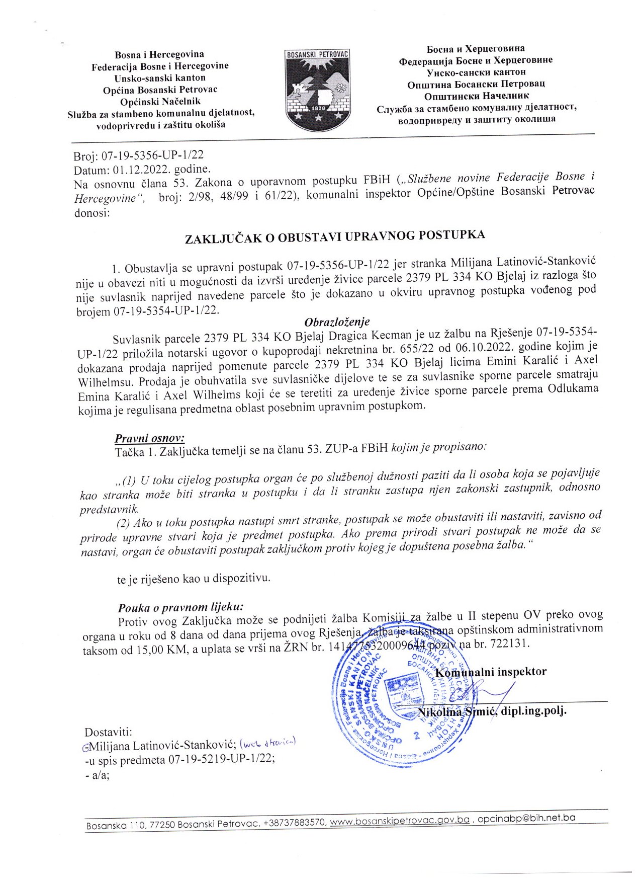 Zaključak o obustavi upravnog postupka Milijana Latinović- Stanković i Aleksandra Latinović
