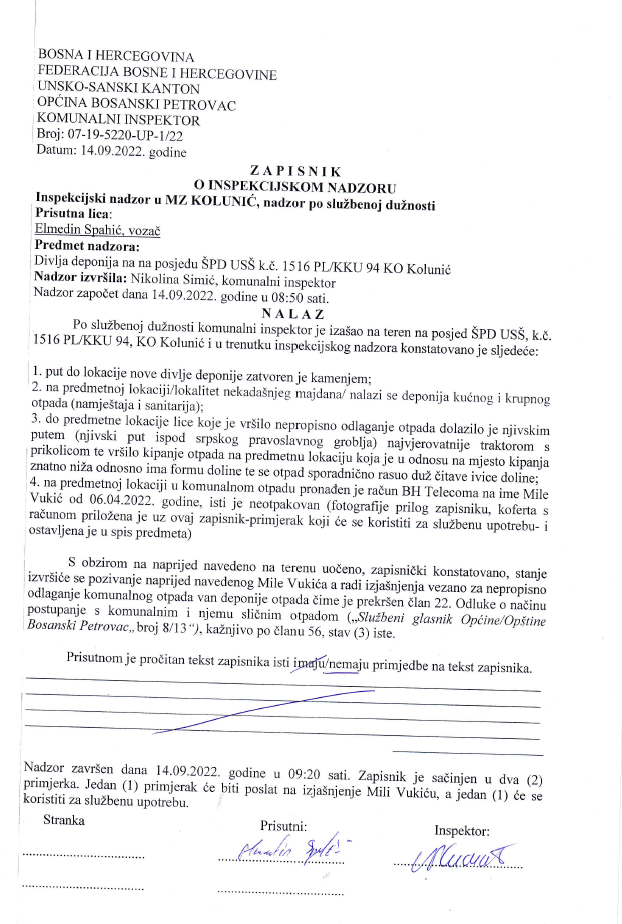„Poziv na izjašnjenje na ZoIN, stranka Mile Vukić, komunalna inspekcija“