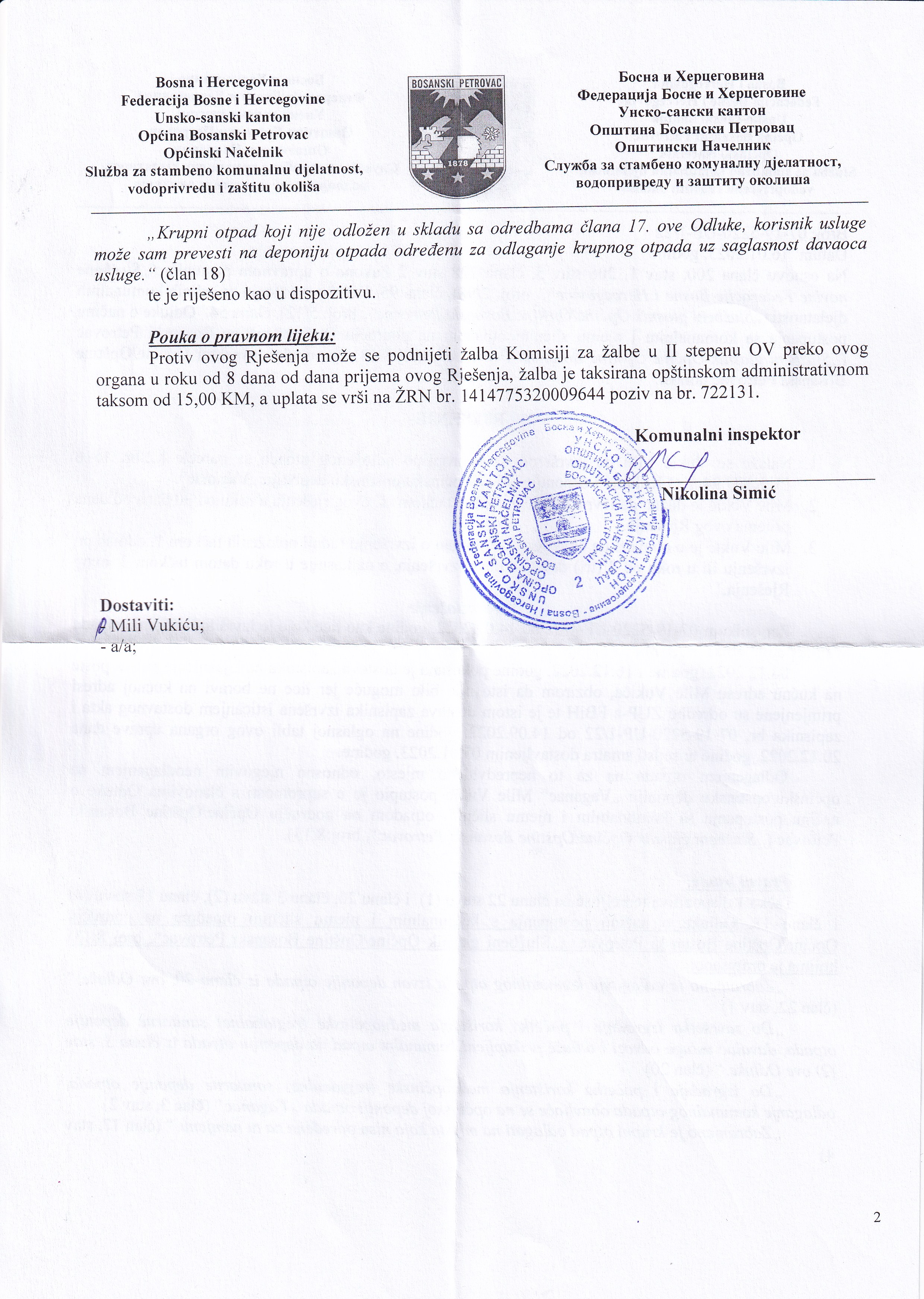 Rješenje, stranka: Mile Vukić, komunalna inspekcija