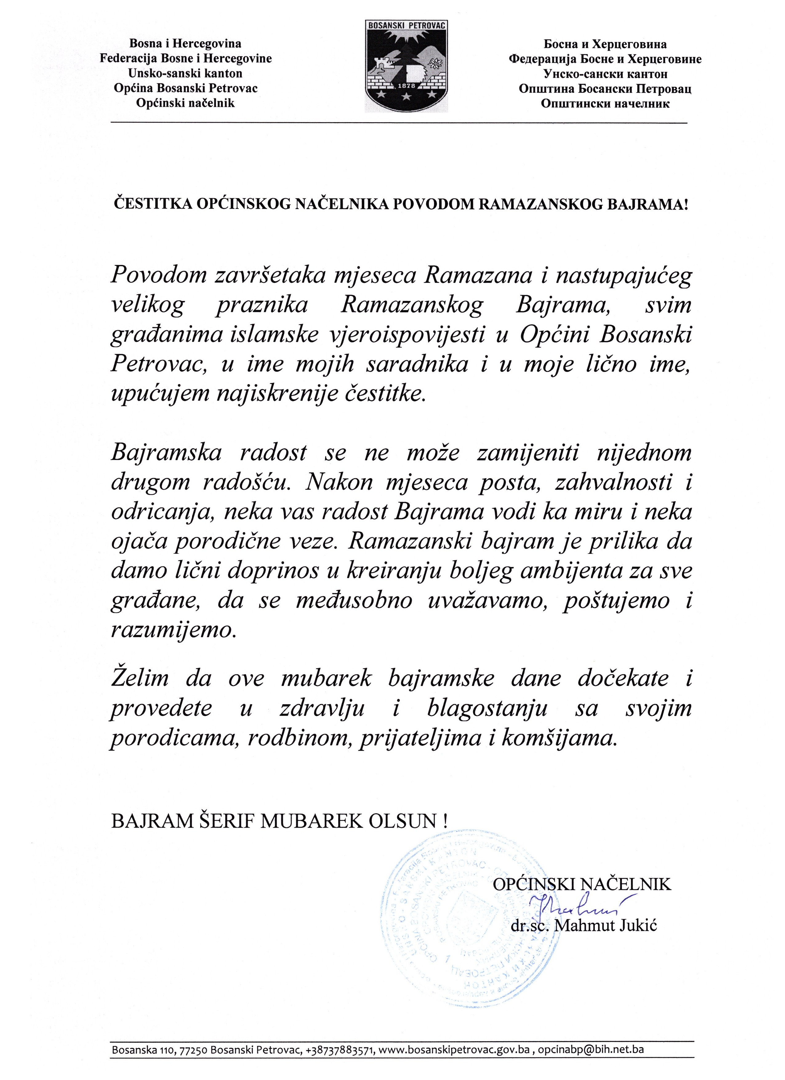 ČESTITIKA OPĆINSKOG NAČELNIKA POVODOM RAMAZANSKOG BAJRAMA