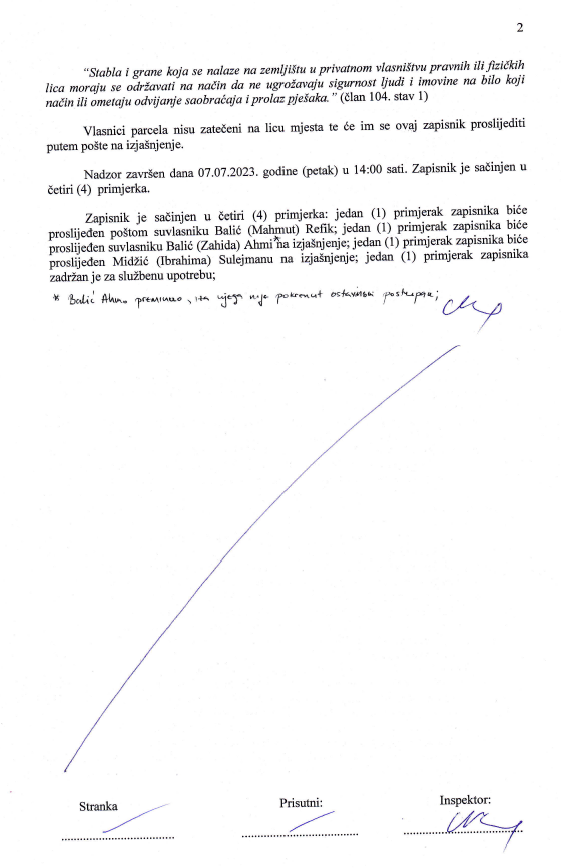 Zapisnik br. 07-19-4993-UP-1/23 od 07.07.2023. godine, dostavlja se na izjašnjenje Balić (Mahmut) Refik - Reuf, komunalna inspekcija