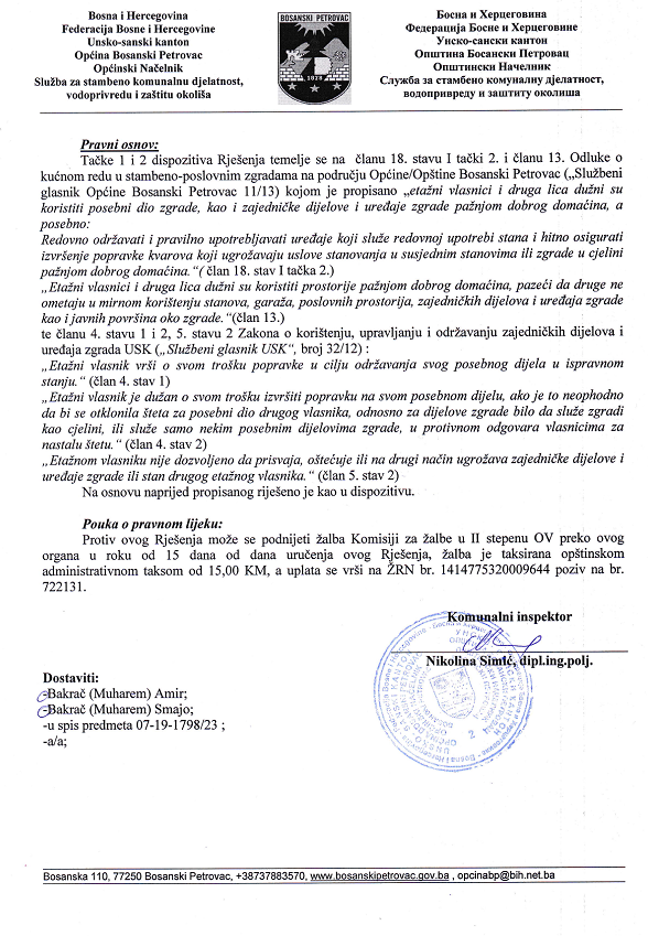 Rješenje Bakrač (Muharem) Amir i Bakrač (Muharem) Smajo, komunalna inspekcija