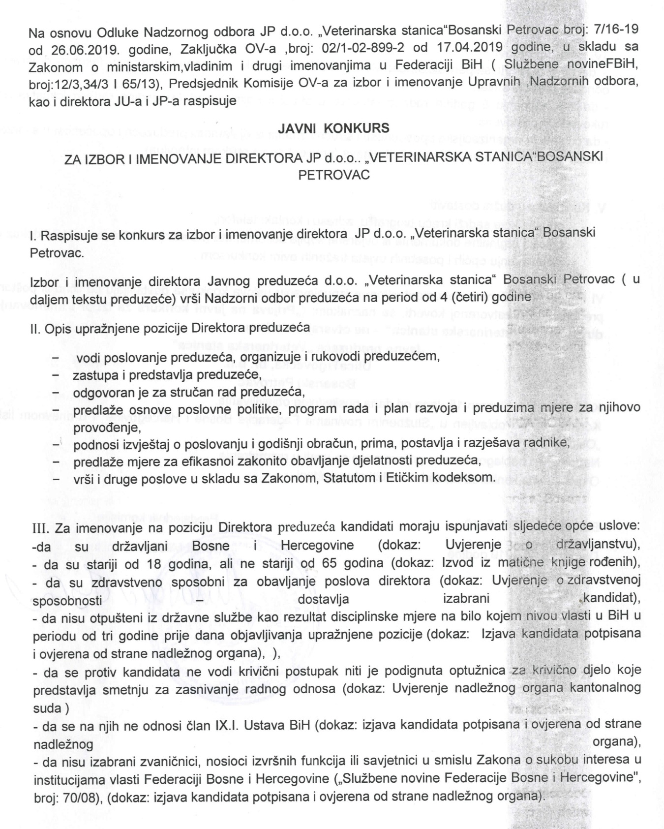 Javni konkurs za izbor i imenovanje direktora JP Veterinaska stanica