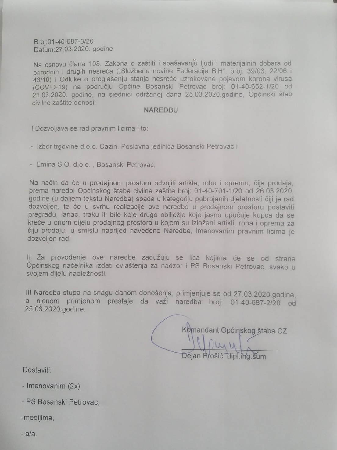 Naredba Štaba civilne zaštite, 27.03.2020.god.